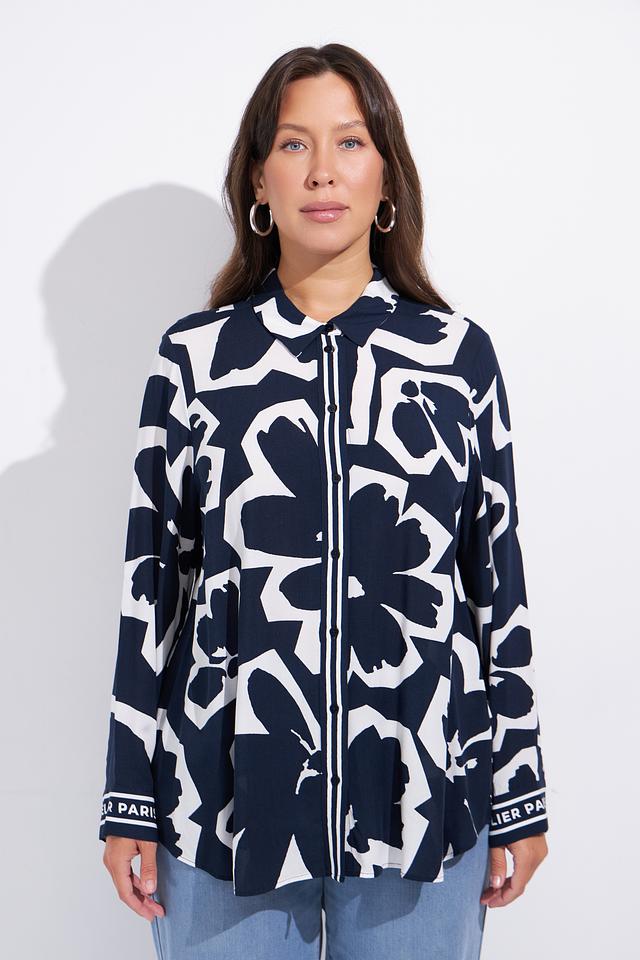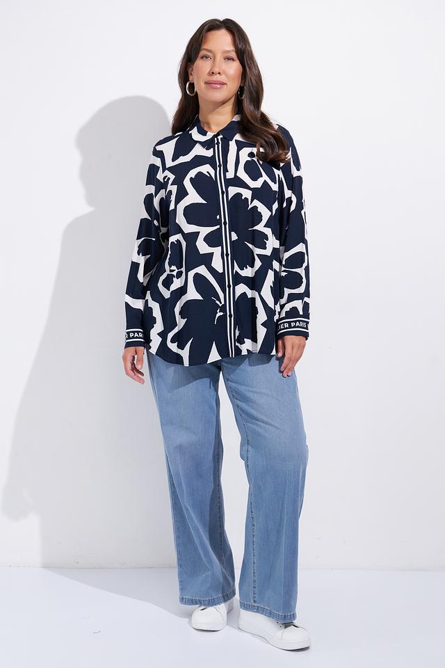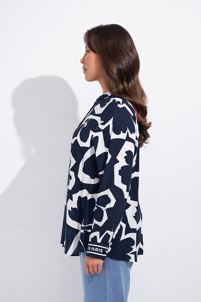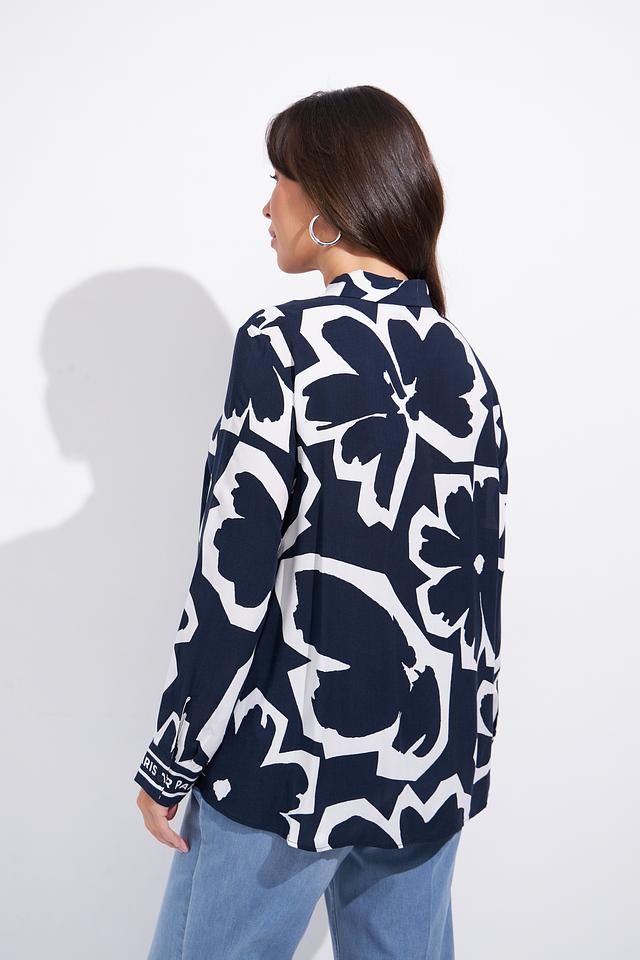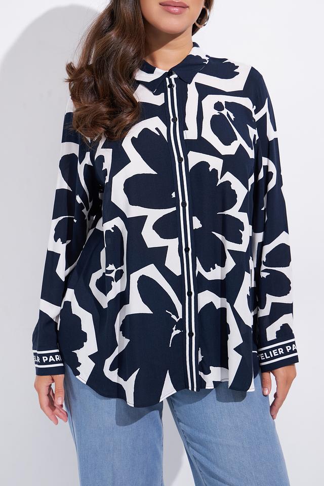Блуза Via Appia темно-синего цвета с ярким цветочным принтом и надписями на манжетах. Модель выполнена из мягкой вискозы, обеспечивающей комфорт в носке. Стильное и оригинальное решение для создания модных образов. Состав: вискоза 100%