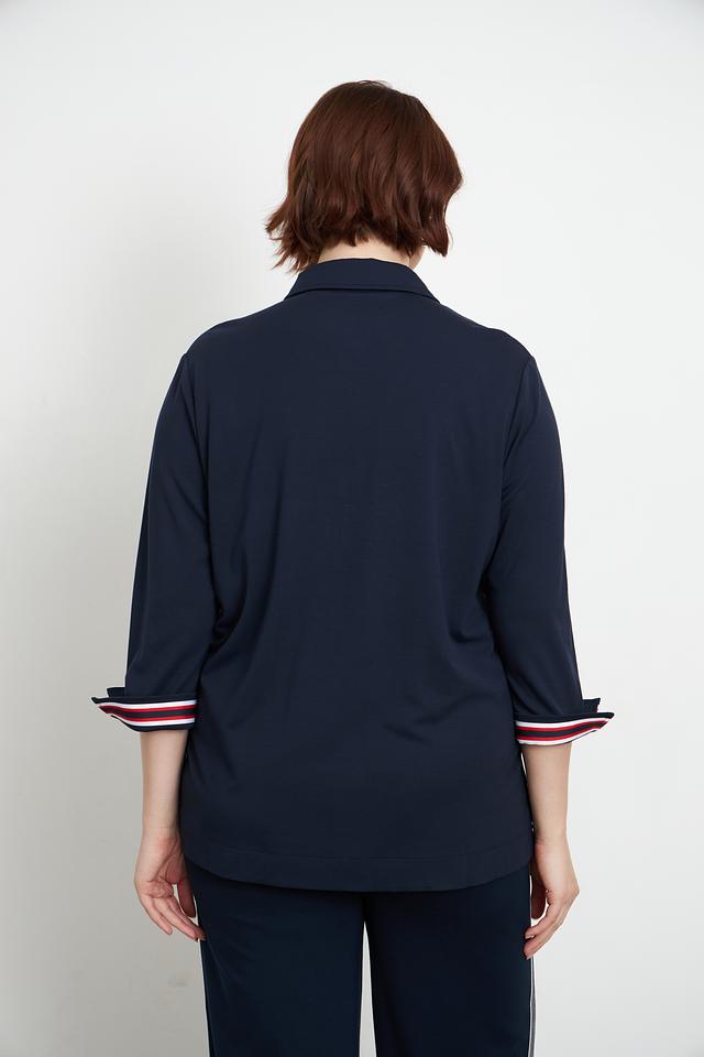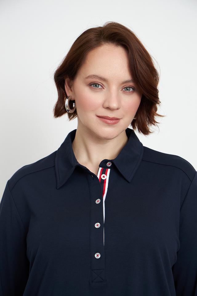 Рукава блузы 3/4, с манжетами, украшенными декоративной полосой в красно-белую полоску. По низу блузы также присутствует небольшая декоративная полоса. Свободный крой обеспечивает комфорт при носке.