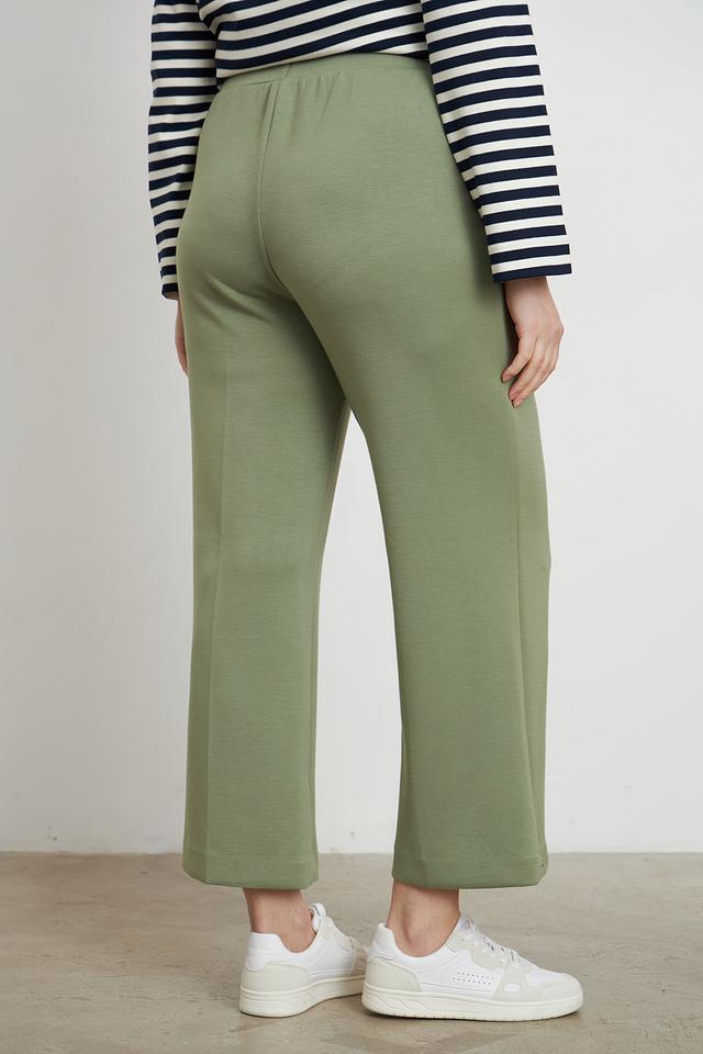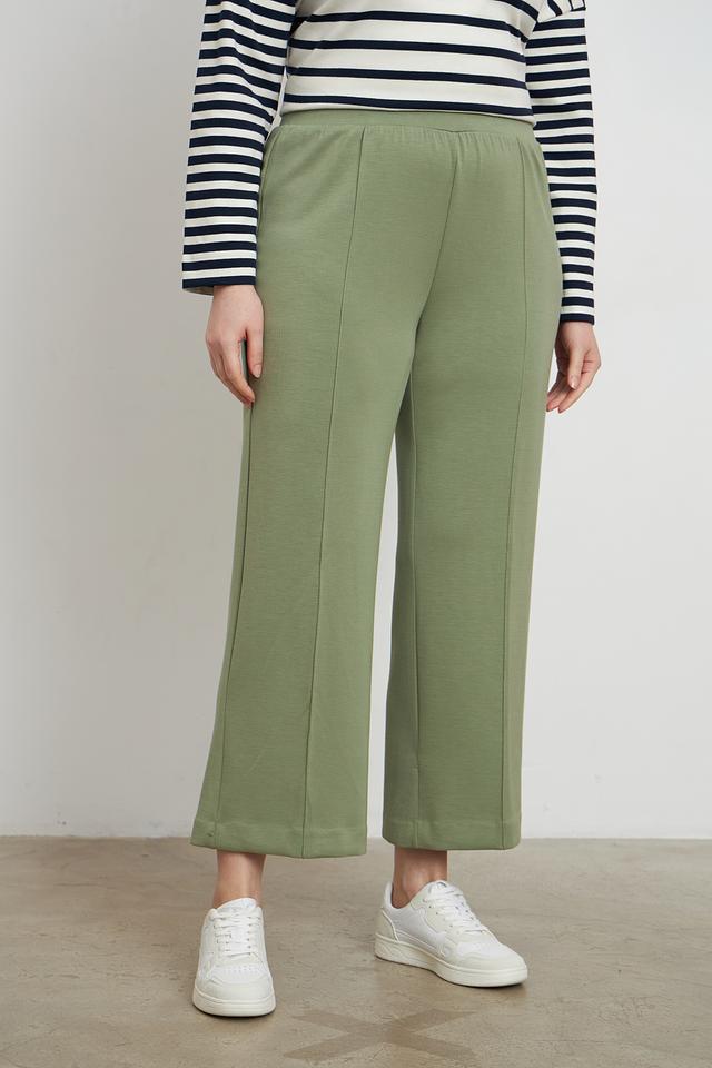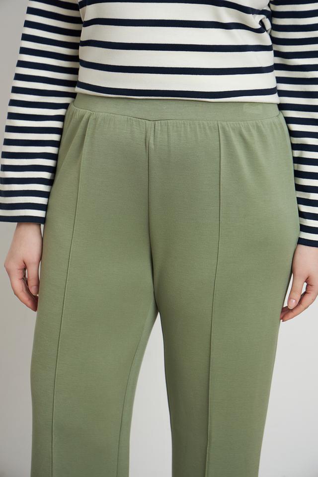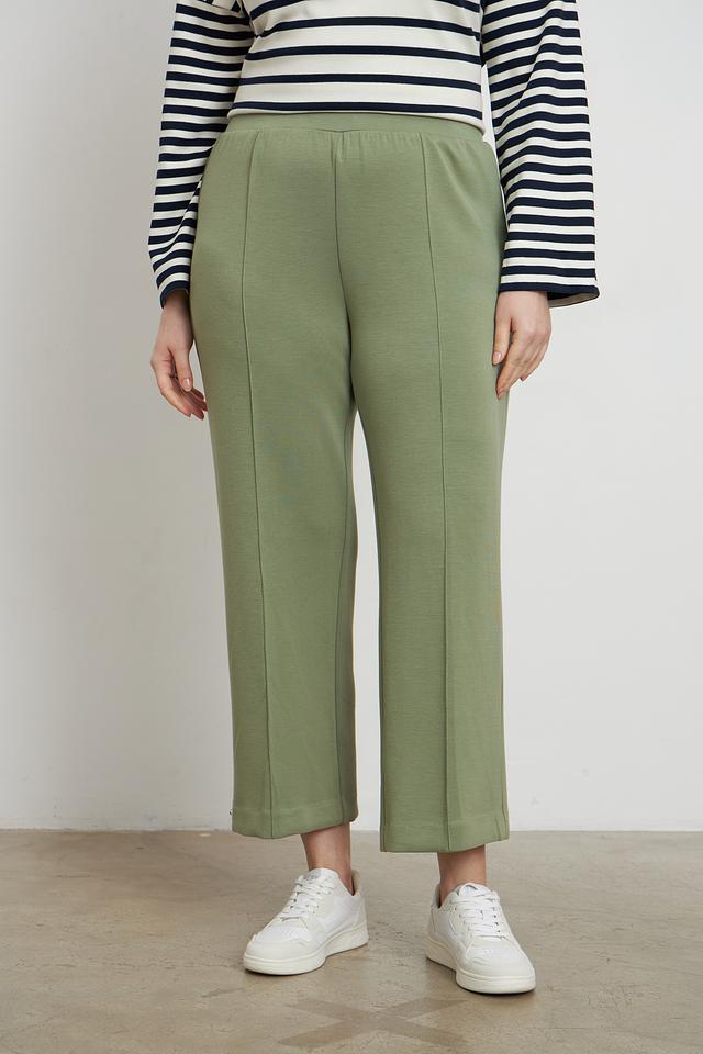 Брюки имеют прямой крой и длину до щиколотки, что делает их актуальными и современными. Эластичный пояс обеспечивает комфортную посадку и не сковывает движения. Наличие вертикальных вытачек спереди визуально вытягивает силуэт и придает брюкам более элегантный вид.