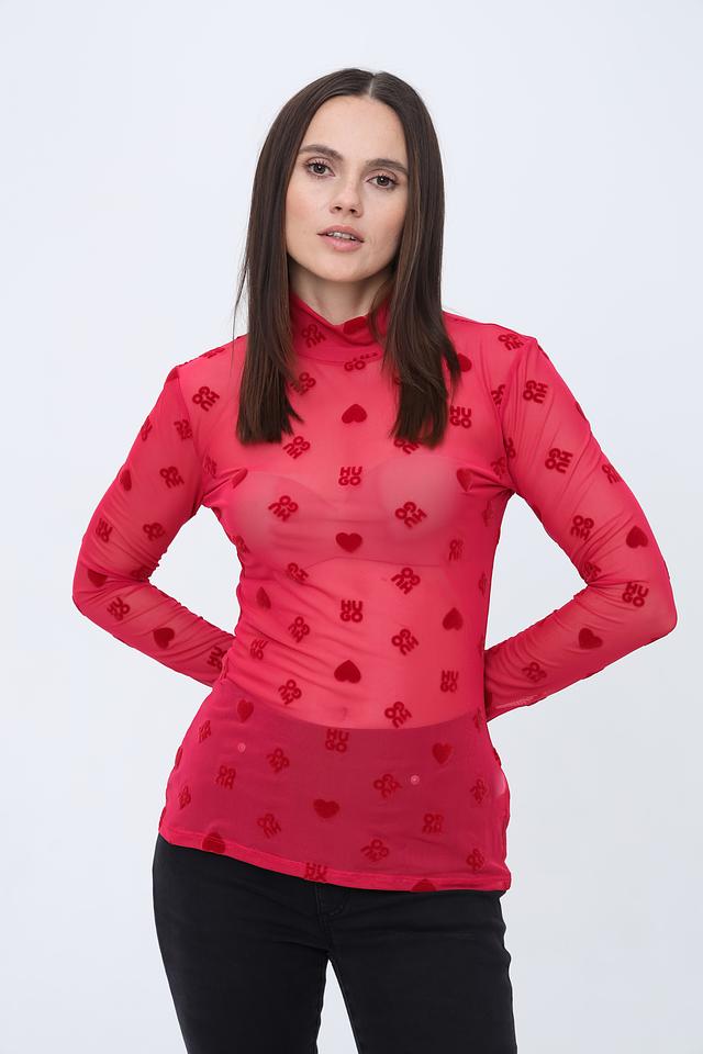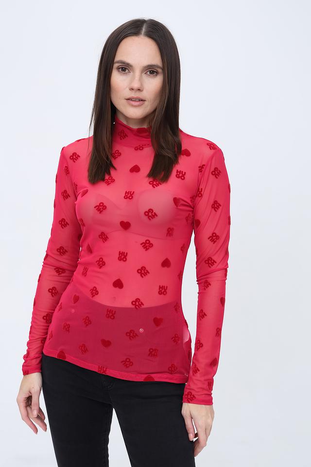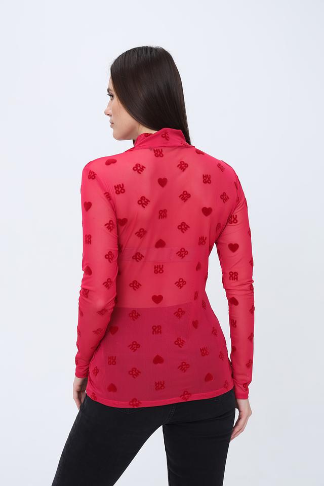 Эта водолазка от Hugo – стильное и современное решение для создания эффектного образа. Изготовленная из полупрозрачной ткани, она имеет насыщенный розовый цвет и украшена принтом в виде сердец и логотипа бренда.