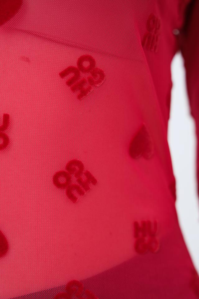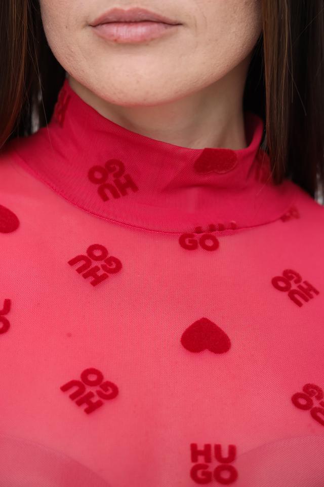 Водолазка Hugo насыщенного розового цвета выполнена из полупрозрачной ткани с принтом в виде сердец и логотипа бренда. Модель с длинными рукавами станет ярким акцентом в вашем образе. Состав: полиэстер 94%, эластан 6%