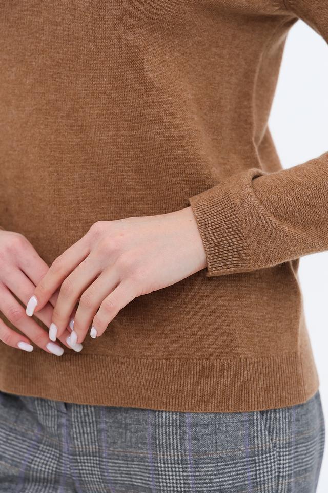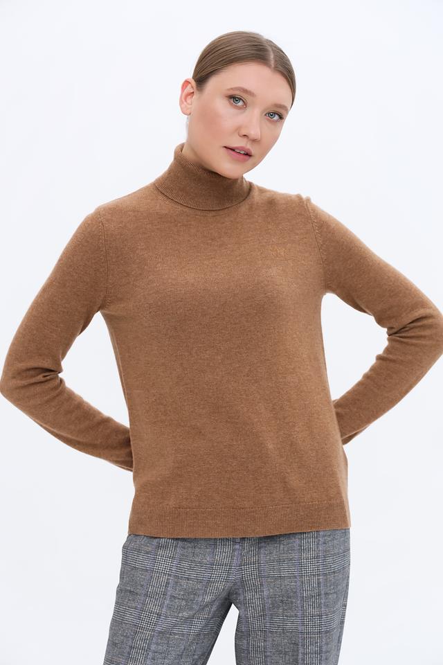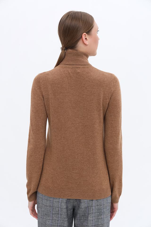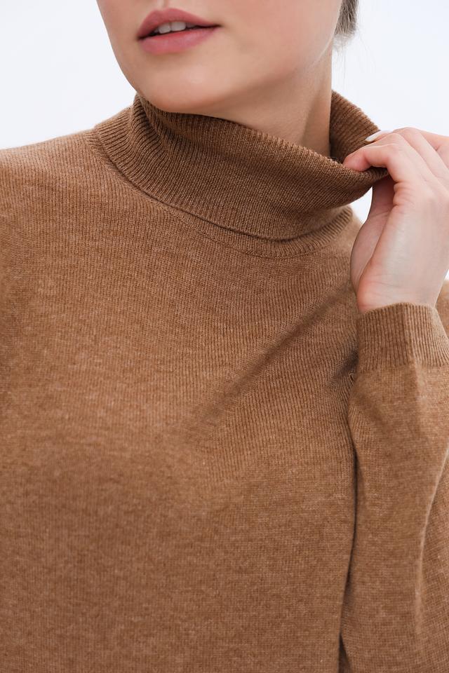 Водолазка имеет классический крой, который подчеркивает фигуру, не сковывая движений. Коричневый цвет придает изделию элегантность и универсальность, позволяя легко сочетать его с различными элементами гардероба.
