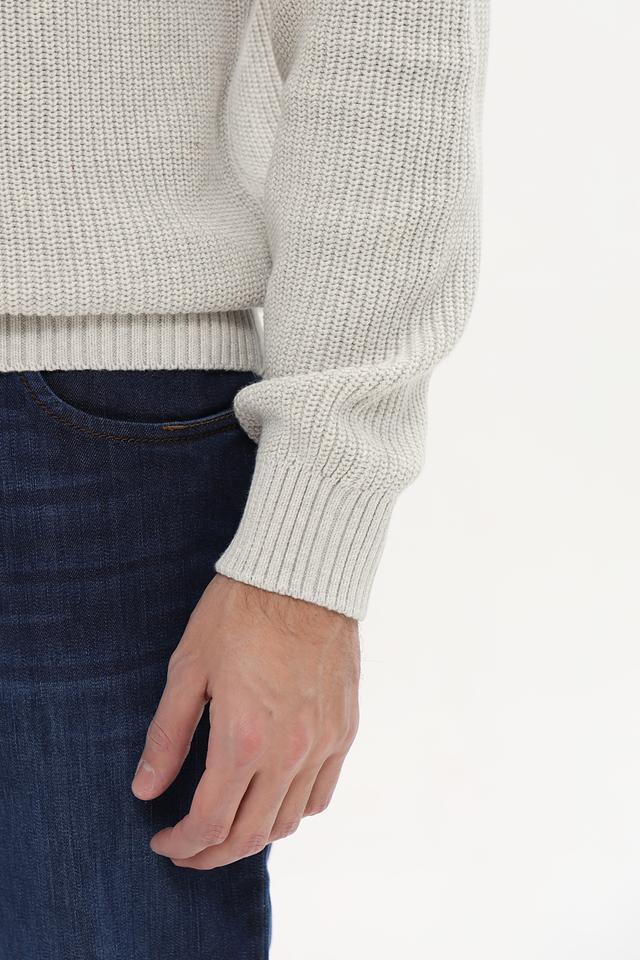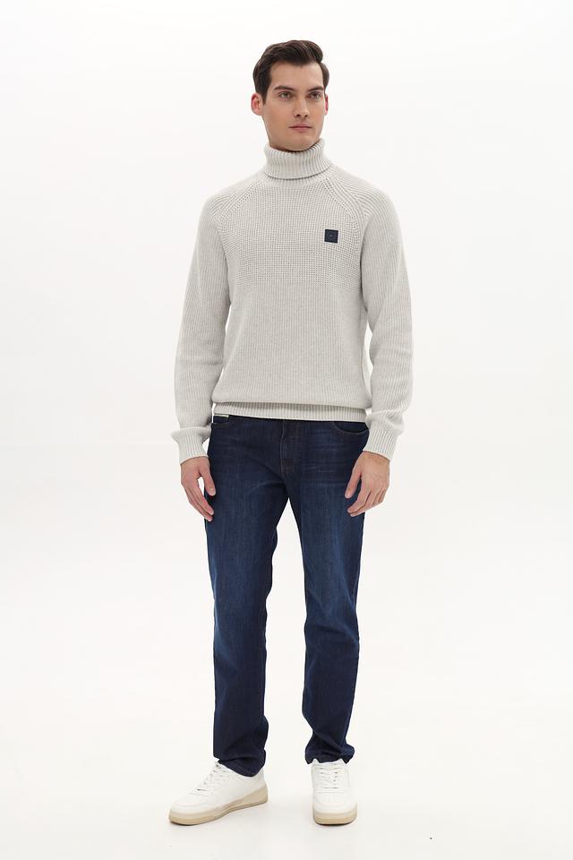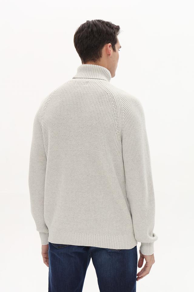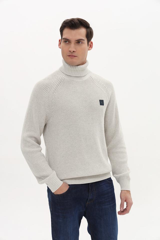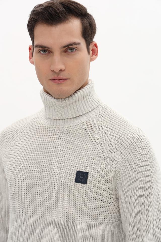 Водолазка имеет светло-серый цвет и текстурный вязаный узор, который придает ей особый шарм. Высокий воротник-стойка защищает от холода, а классический крой подходит для мужчин любой комплекции.