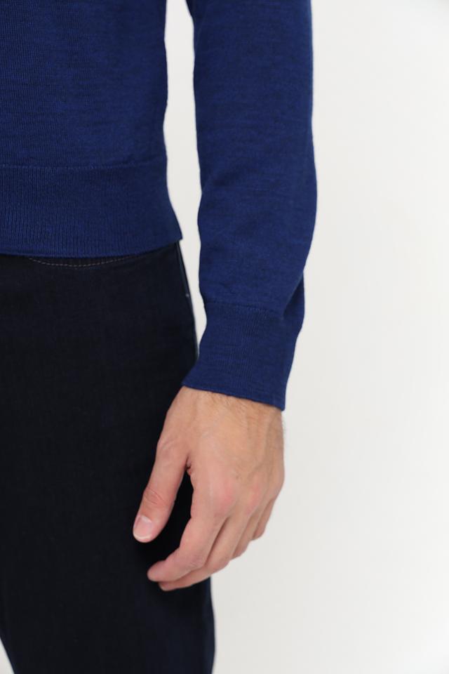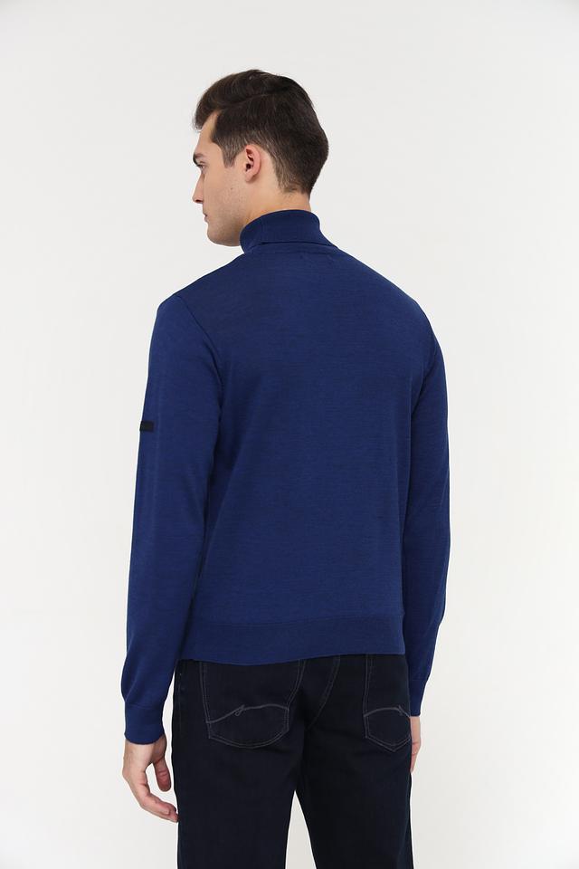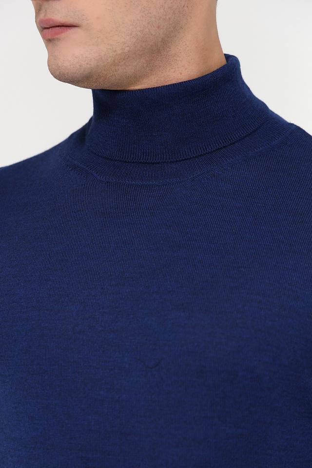 Водолазка имеет классический силуэт, идеально облегающий фигуру. Высокий воротник-стойка защищает от холода и придаёт образу элегантность. Насыщенный синий цвет легко сочетается с другими элементами гардероба, позволяя создавать разнообразные стильные комбинации.