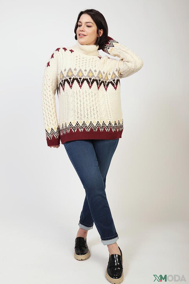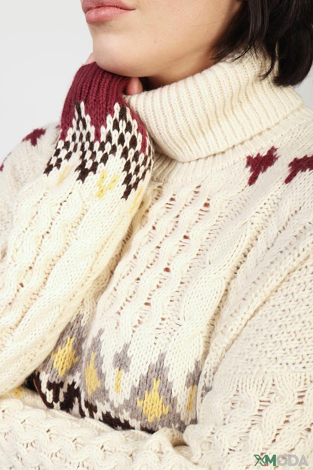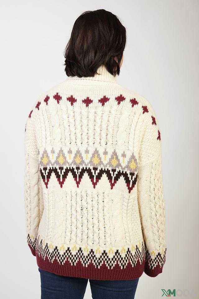 Основной цвет водолазки – кремовый, который служит идеальным фоном для яркого жаккардового узора в виде полосок. Узор выполнен в сочетании бордового, серого и бежевого цветов, что придает изделию оригинальность и выразительность.