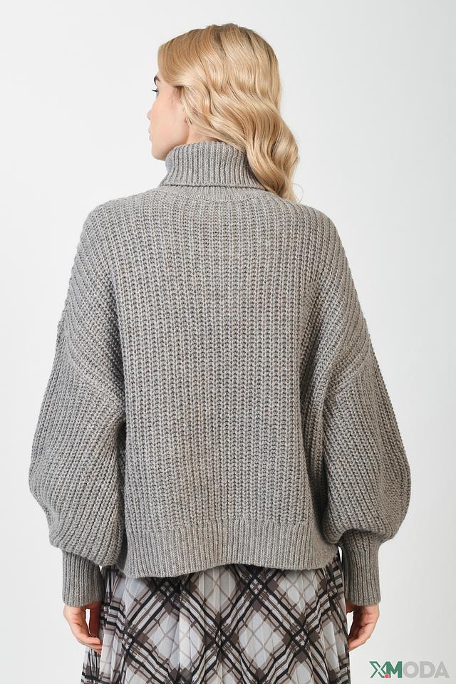 Свитер имеет свободный крой, который не сковывает движений, а рукава-фонарики добавляют образу оригинальности. Высокий воротник защищает от ветра и холода, а крупная вязка придает изделию текстуру и объем.