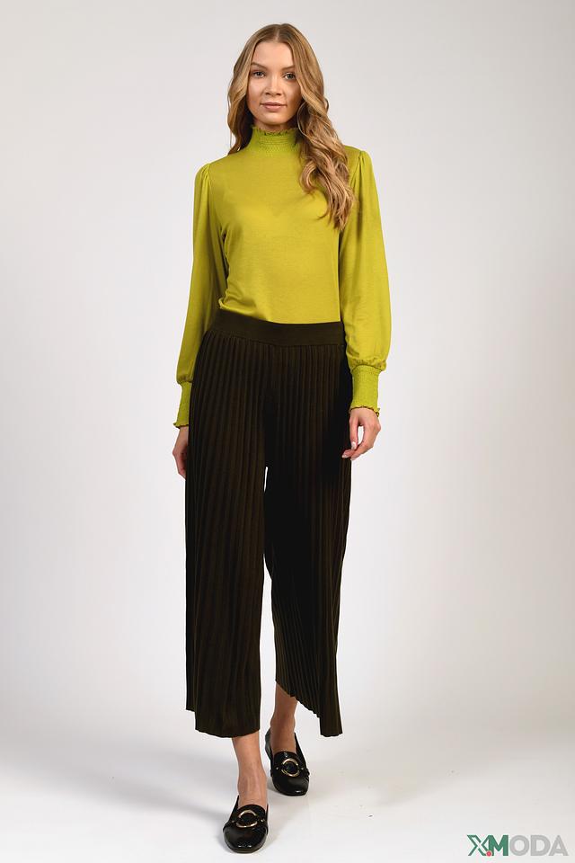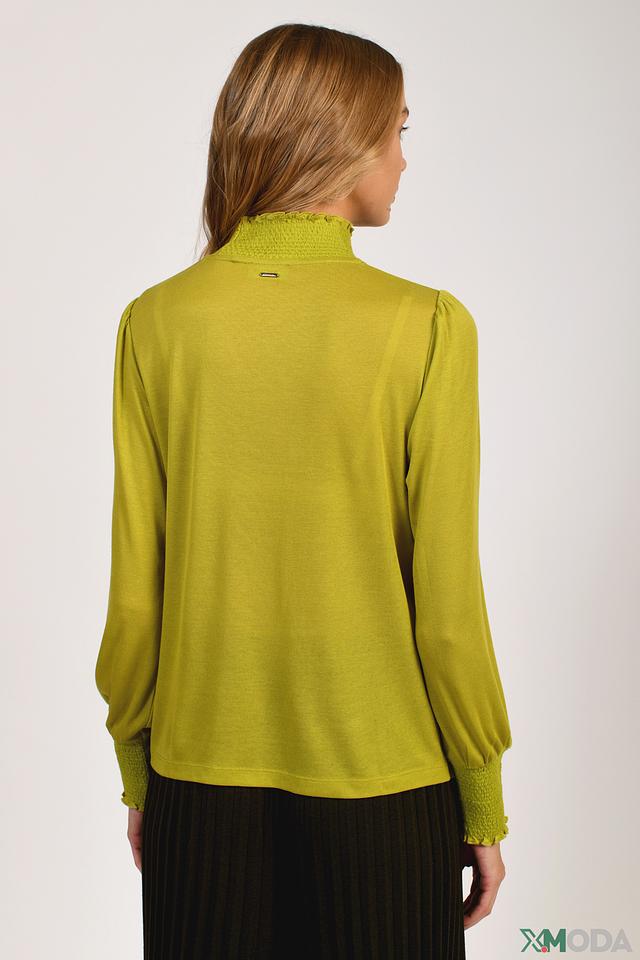 Модель отличается оригинальным дизайном: деликатная сборка по горловине создает эффект рюши, придавая образу женственность. Рукава слегка расклешены к низу и заканчиваются эластичными манжетами, обеспечивающими удобную посадку.