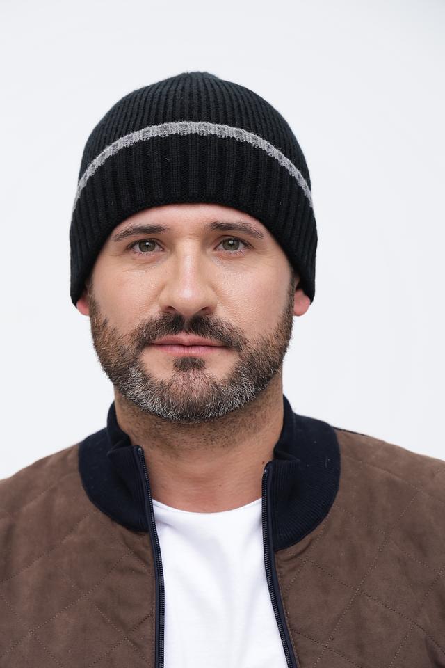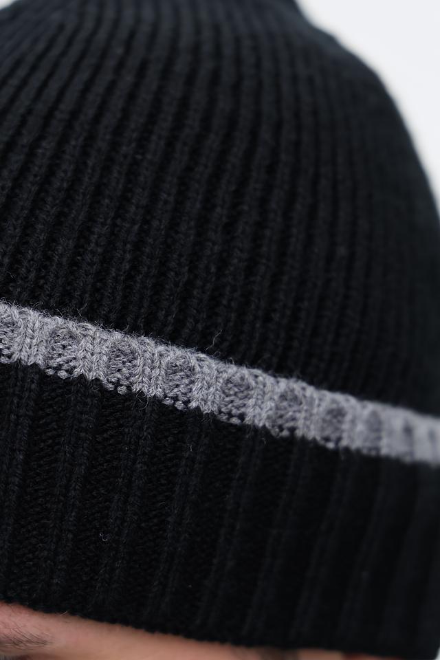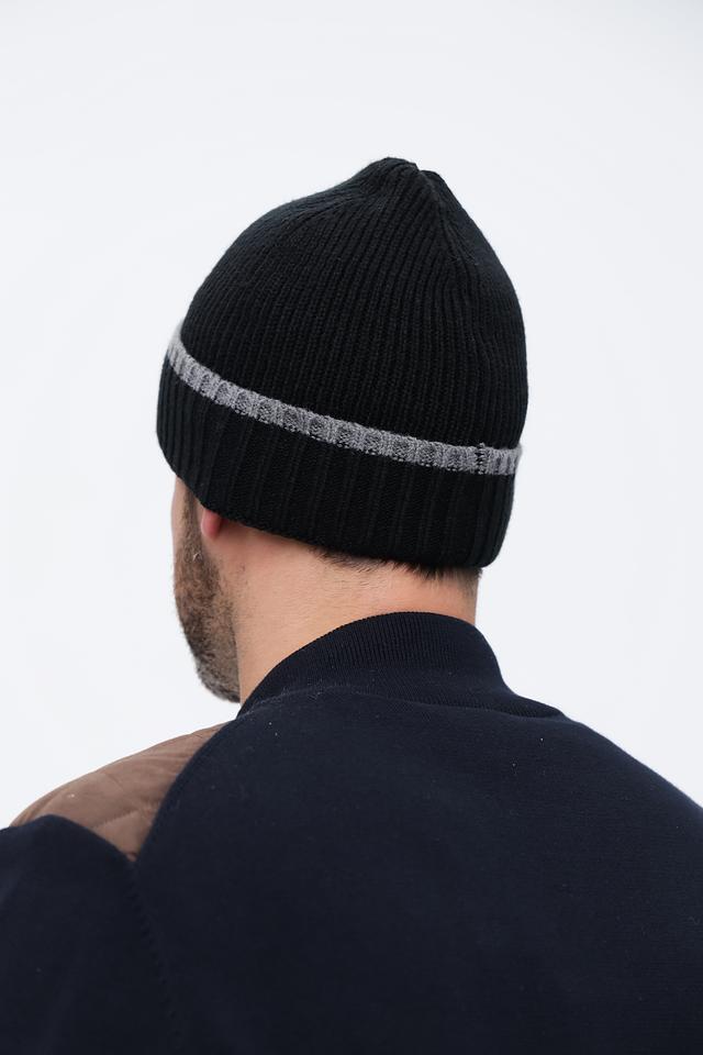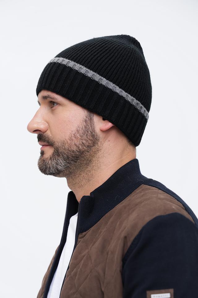 Шапка имеет классический дизайн, представленный в чёрном цвете с контрастной серой полосой. Эта деталь добавляет шапке современный вид и делает её универсальной для различных стилей одежды.