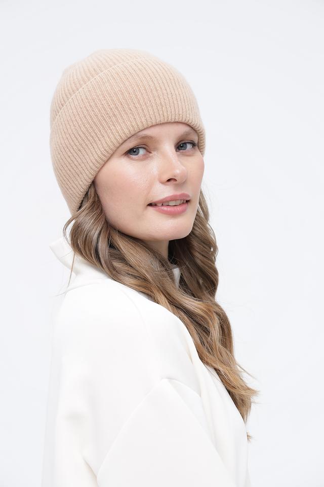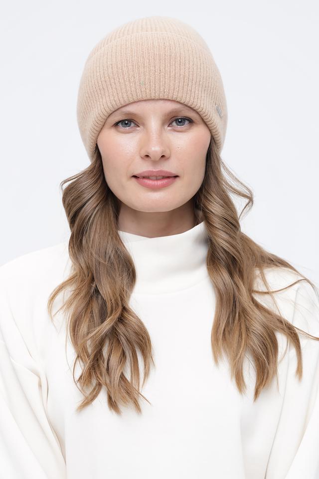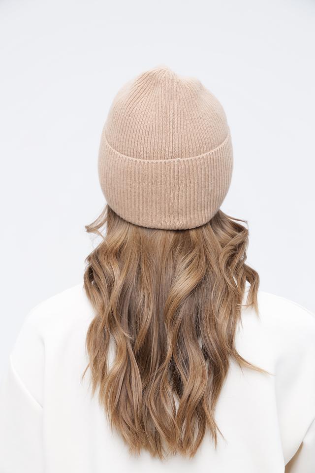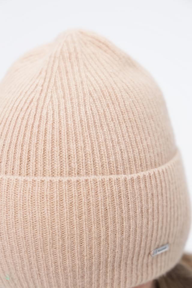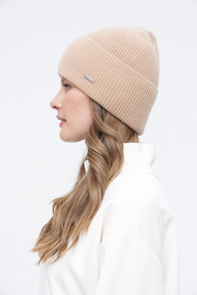 Шапка имеет классическую форму и нейтральный бежевый цвет, который легко сочетается с различными стилями одежды. Минималистичный дизайн дополнен небольшим металлическим логотипом бренда, что придает шапке элегантный вид.