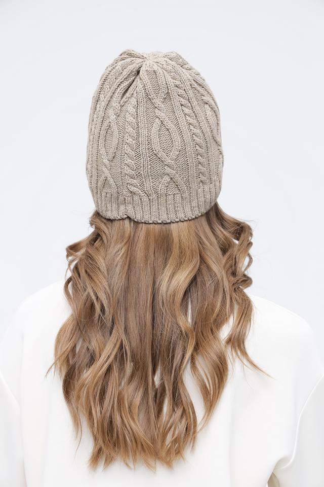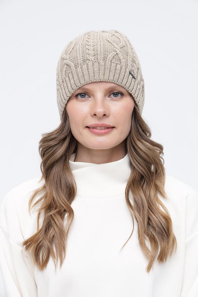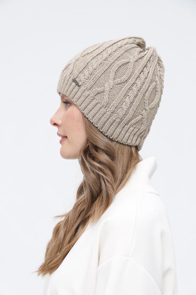 Шапка имеет классическую форму и универсальный бежевый цвет, который легко сочетается с любой одеждой. Объемный узор в виде кос добавляет шапке текстуру и визуальный интерес.
