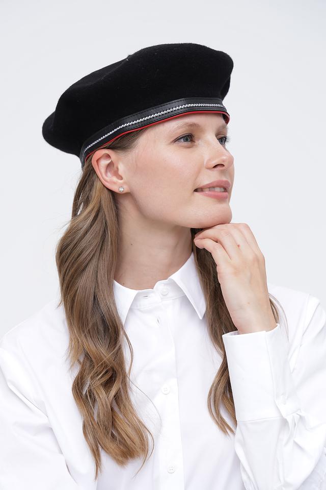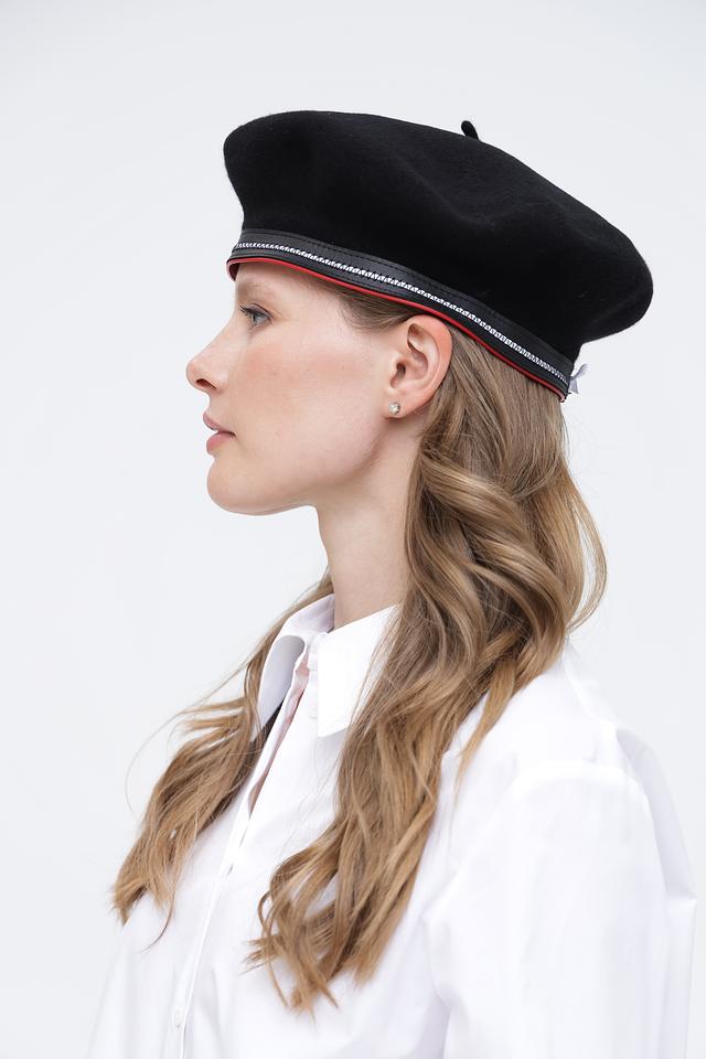Особенностью этого берета является декоративная лента, расположенная по окружности, с красными и белыми полосами, а также небольшим белым бантиком спереди. Это придает аксессуару изысканность и индивидуальность.