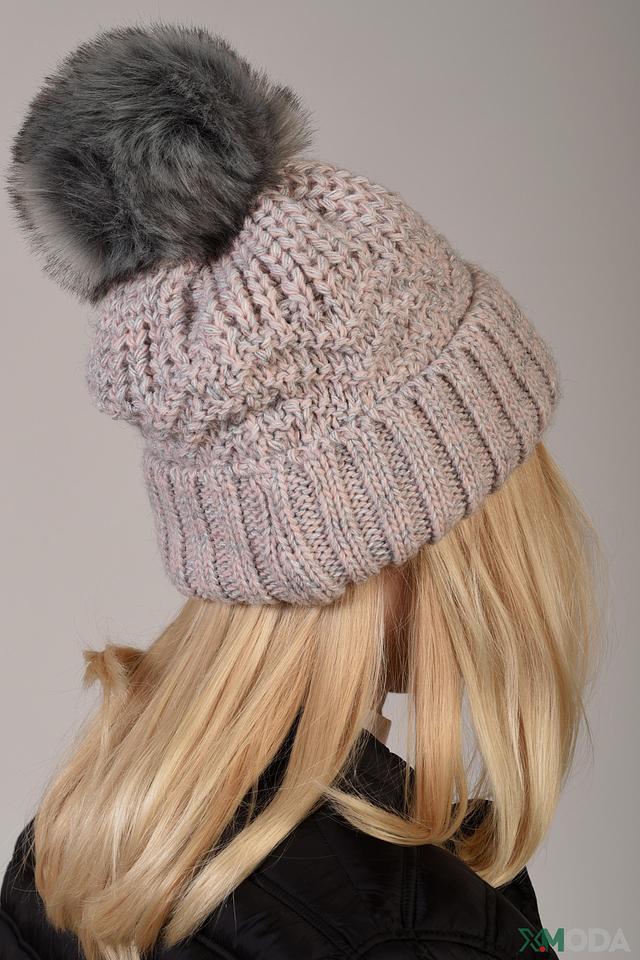 Шапка имеет классическую форму и оснащена большим помпоном из искусственного меха серого цвета, что придает ей особый шарм и привлекательность. Вязаная текстура шапки обеспечивает комфорт и тепло в холодную погоду.
