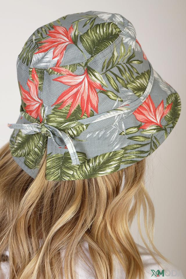 Шляпа имеет оригинальный дизайн с ярким тропическим принтом, который добавит вашему образу летнее настроение. Серый фон оттеняет сочные красные цветы и пышную зелень листьев, создавая гармоничное сочетание цветов.