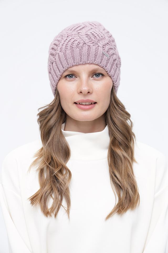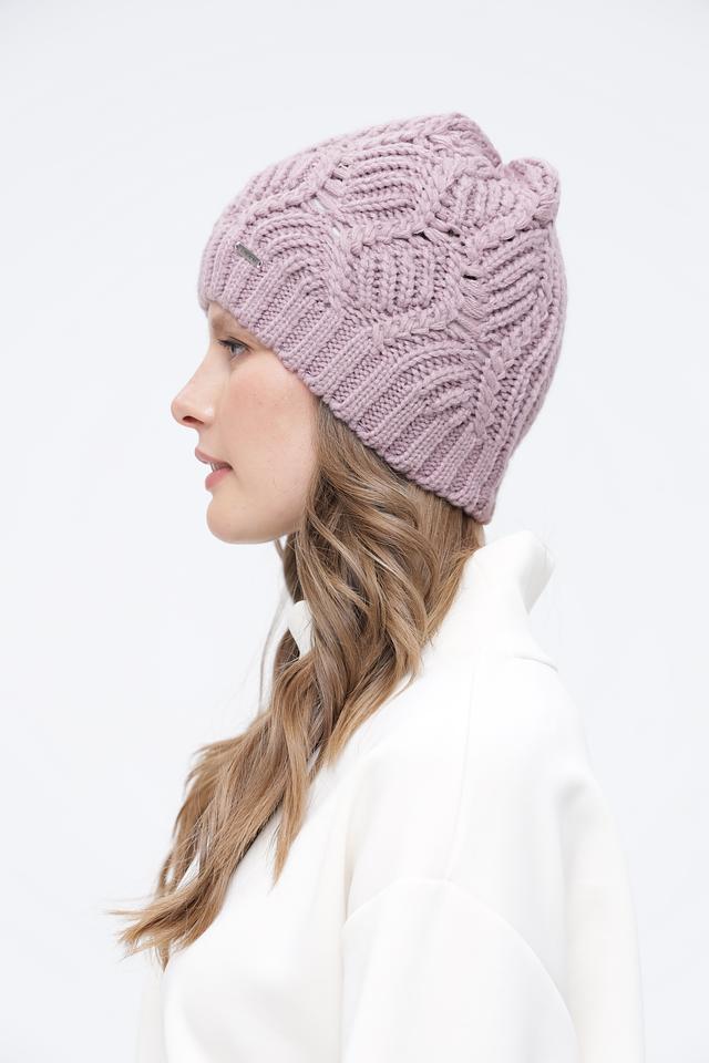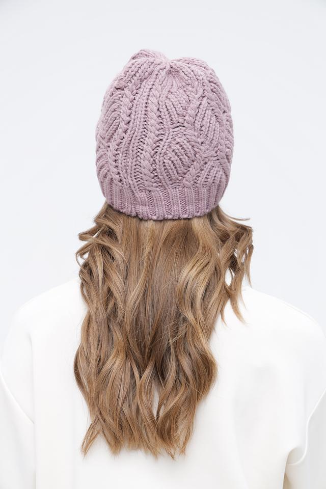 Основной цвет шапки – нежный лавандовый, который прекрасно сочетается с различными оттенками одежды. Особое внимание привлекает фактурный вязаный узор в виде кос, придающий шапке оригинальный и элегантный вид.