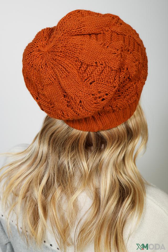 Шапка имеет рыжий цвет и выполнена объемной вязкой с выразительным узором. Такая текстура не только привлекает внимание, но и хорошо сохраняет тепло. Удобная посадка и мягкие материалы делают эту шапку комфортной в носке.
