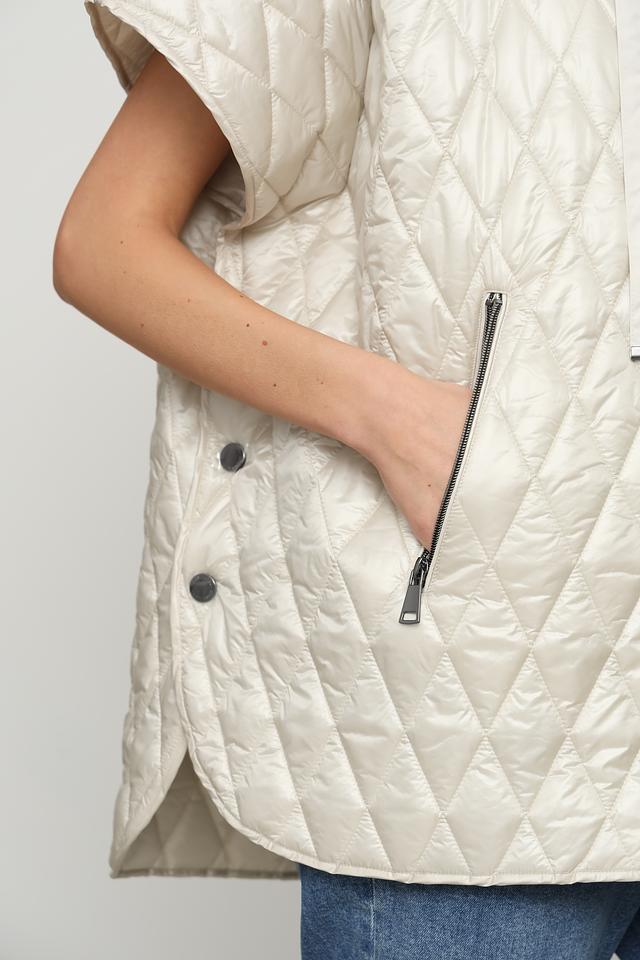 Жилет имеет стеганую текстуру, которая придает ему современный вид. Капюшон добавляет функциональности и защищает от ветра. Застежка-молния позволяет регулировать степень теплоты и создавать разные силуэты.