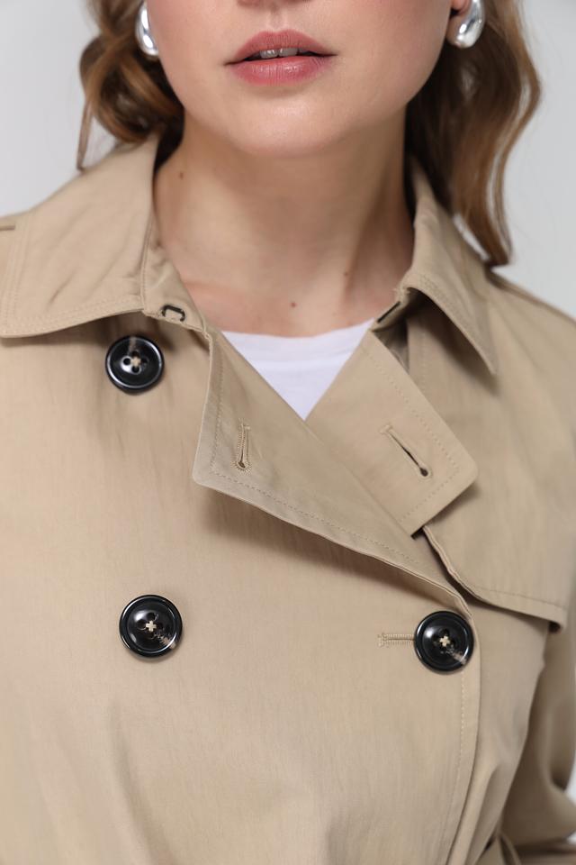 Плащ имеет двубортную застёжку на пуговицы, что придает ему строгий и утонченный вид. Пояс позволяет подчеркнуть талию и создать более женственный силуэт. Воротник отложной, с лацканами.