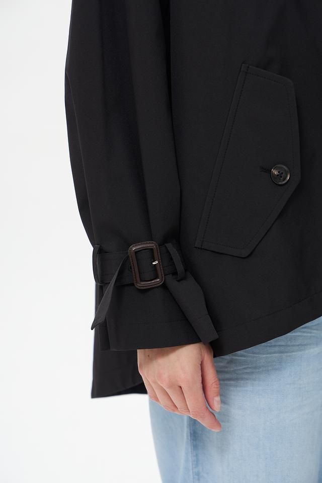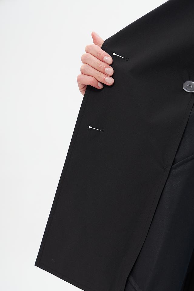 Плащ имеет двубортную застёжку на пуговицы, что придает ему элегантный вид. Пояс позволяет подчеркнуть талию и создать более женственный силуэт. Широкие рукава и свободный крой обеспечивают комфорт и свободу движений.