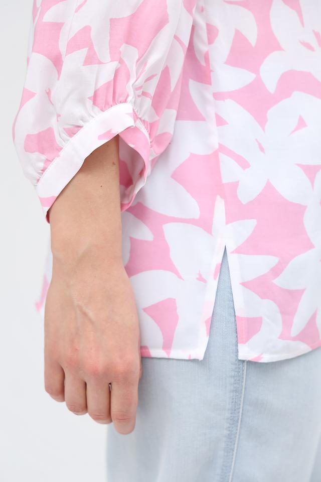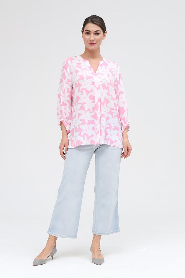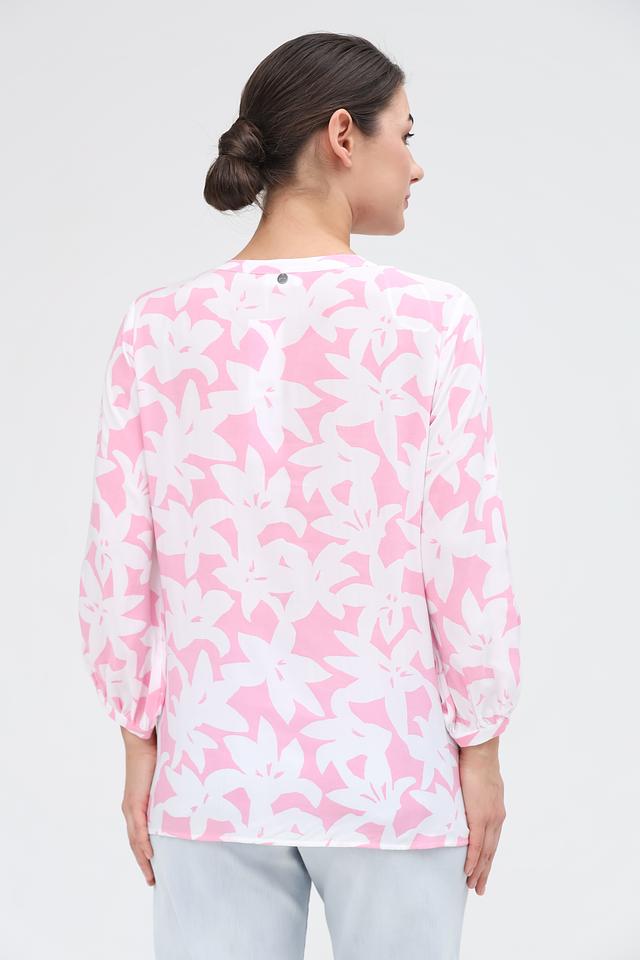Блуза украшена ярким цветочным принтом на розовом фоне, который делает её особенно привлекательной и подходящей для летнего сезона. Она прекрасно сочетается с джинсами, брюками или юбками, позволяя создавать разнообразные стильные образы.