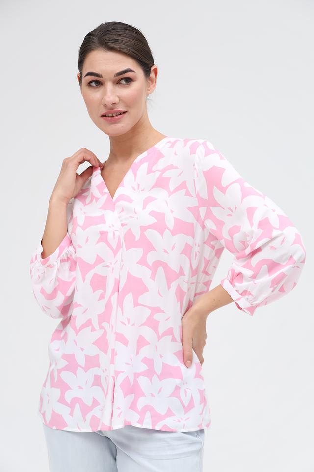 Розовая блуза You Just White с нежным цветочным принтом станет отличным дополнением к вашему гардеробу. Модель выполнена из лёгкой вискозы, имеет V-образный вырез и рукава 3/4 с манжетами. Состав: вискоза 100%