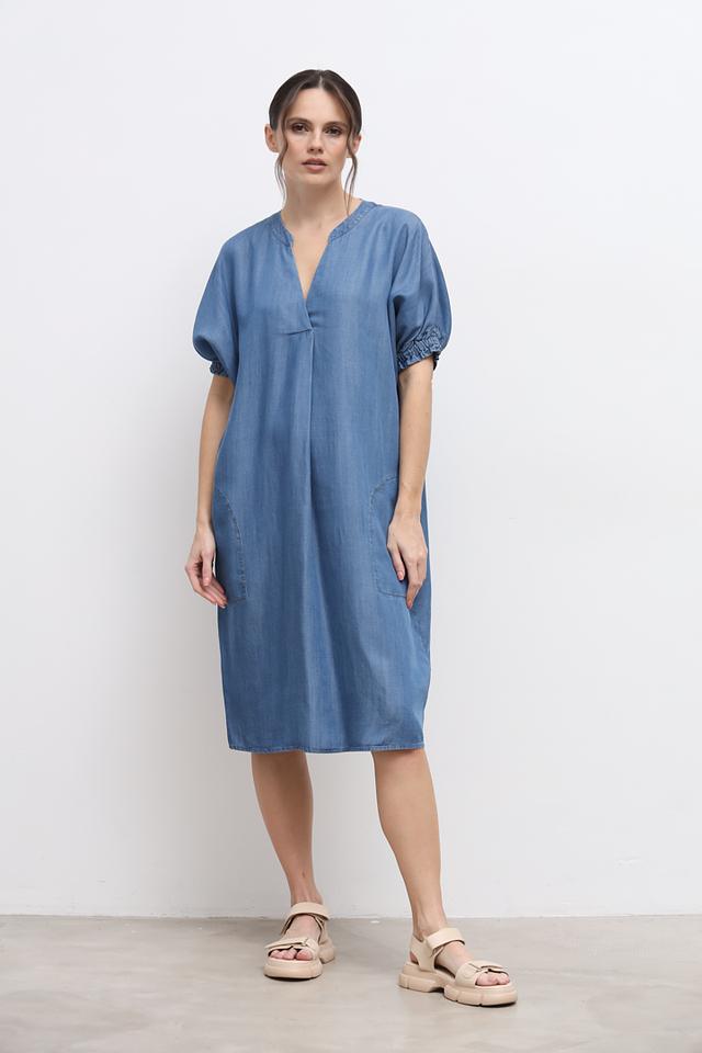 Платье имеет свободный крой, который не сковывает движений и позволяет коже дышать. V-образный вырез горловины подчеркивает женственность, а рукава-фонарики добавляют образу романтичности. Наличие накладных карманов делает модель более практичной.