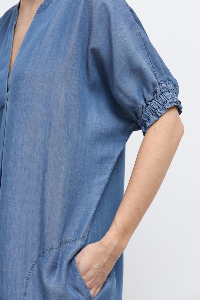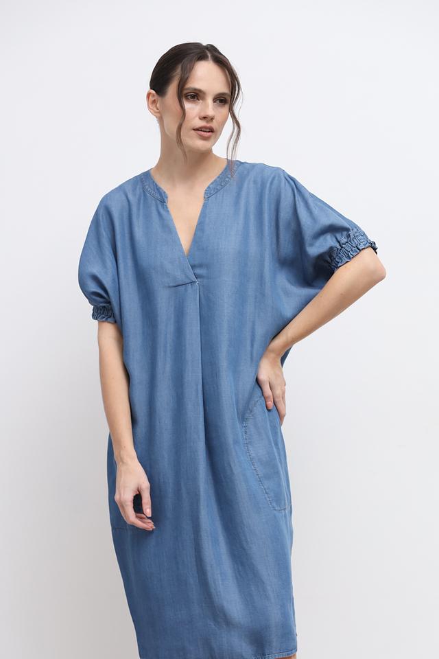 Платье You Just White голубого цвета выполнено из 100% лиоцела. Модель свободного кроя с V-образным вырезом и рукавами-фонариками, дополнена накладными карманами. Состав: лиоцел 100%