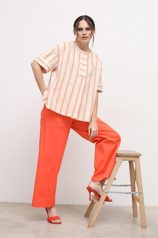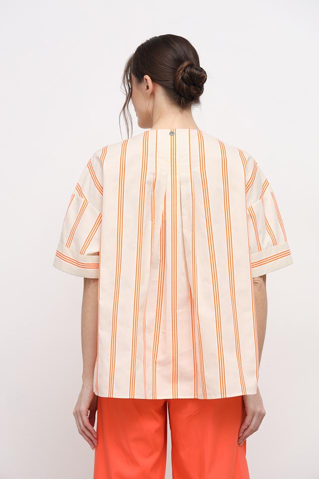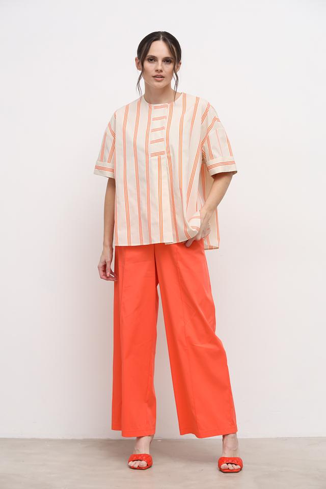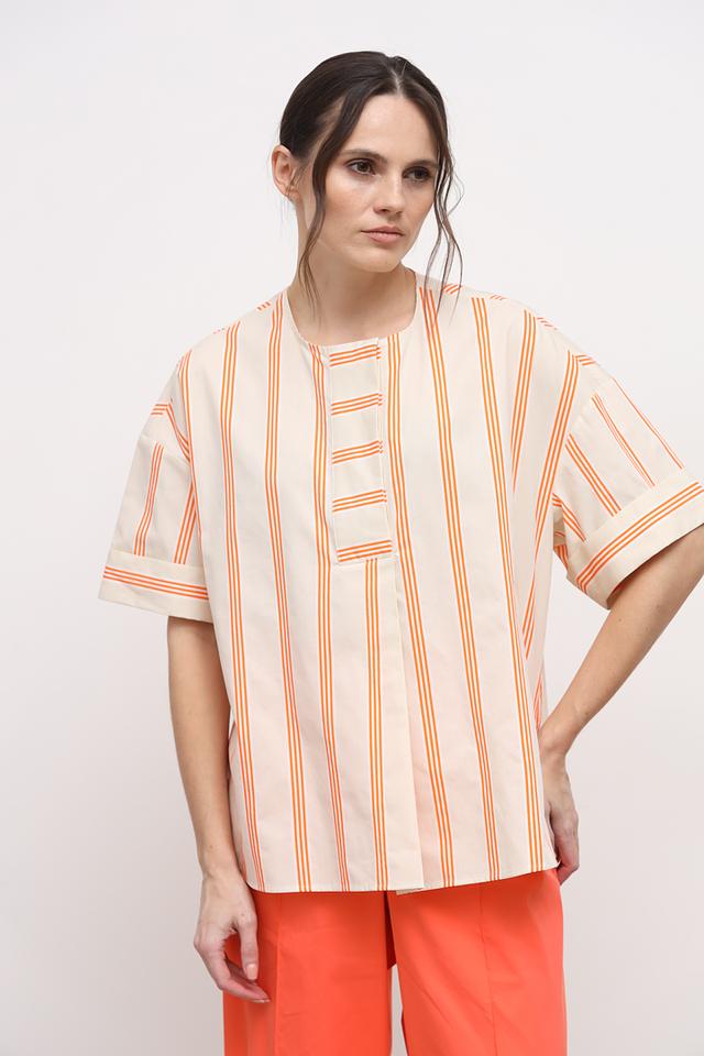 Блуза украшена вертикальными полосками кремового и оранжевого цветов, что придает ей свежий и динамичный вид. Вырез горловины – округлый, дополнен небольшой планкой с пуговицами. Короткие рукава слегка спущены, что добавляет блузе непринужденности.