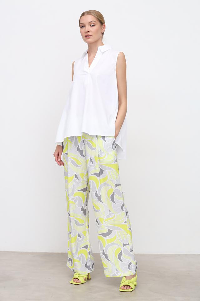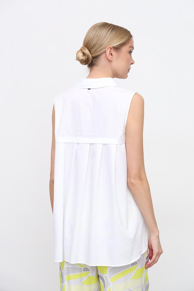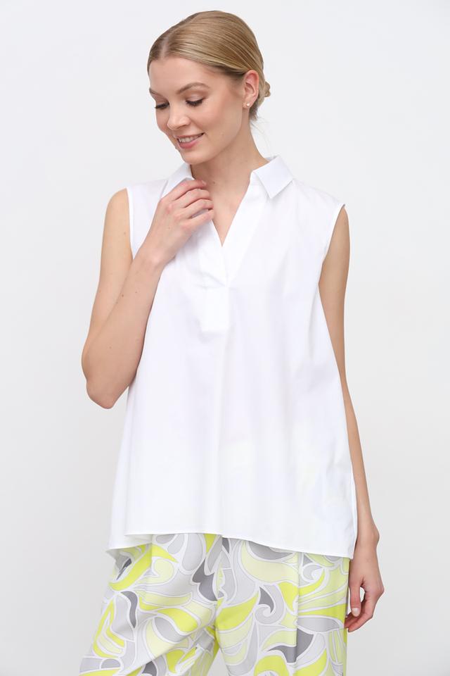 Топ имеет классический крой без рукавов и стильный воротник, который придаёт образу элегантность. Прямой силуэт топа позволяет сочетать его с различными предметами гардероба – от классических брюк до джинсов и юбок.