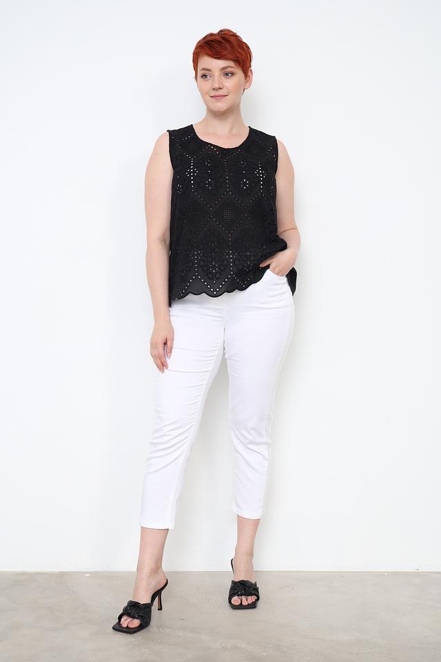 Топ имеет свободный крой, который не сковывает движений и обеспечивает комфорт в жаркую погоду. Отсутствие рукавов делает его идеальным для летних дней. Завершающим штрихом образа станет аккуратная обработка края топа, выполненная в виде волны. Состав топа: 92% хлопок, 8% полиэстер.