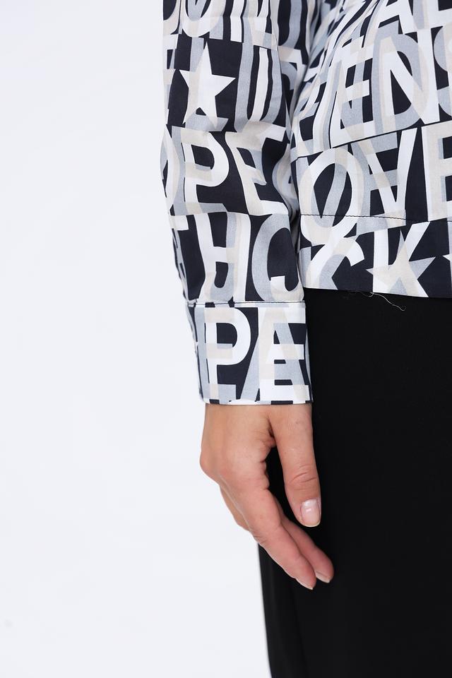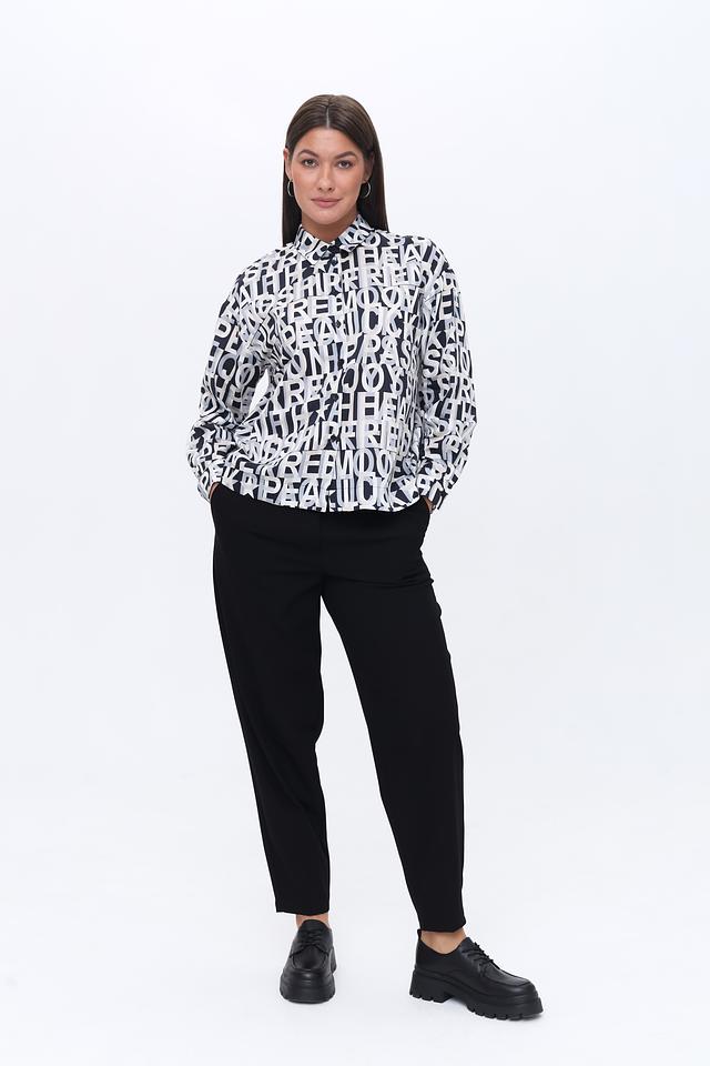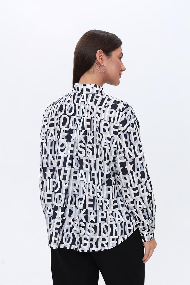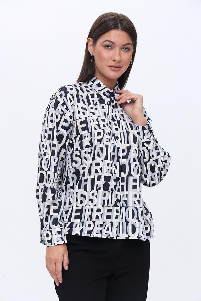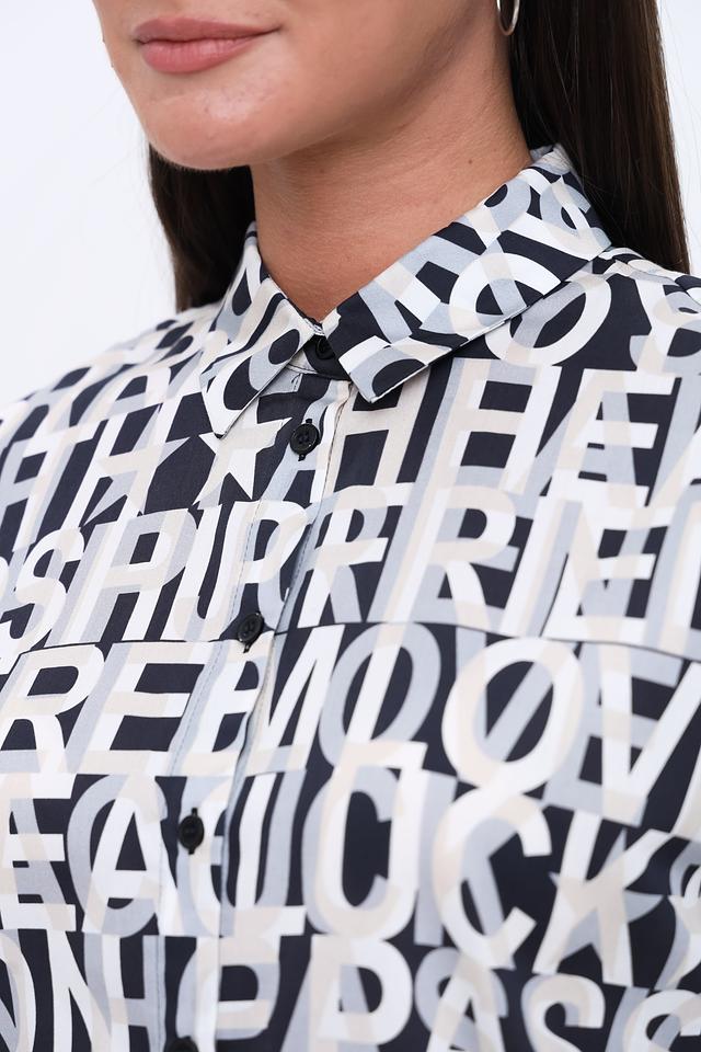 Рубашка имеет свободный крой, длинные рукава и воротник-стойку. Её особенностью является яркий принт, состоящий из повторяющихся надписей, выполненных в чёрном цвете на белом фоне. Такой дизайн делает рубашку заметной и стильной.