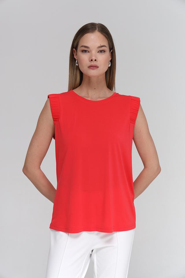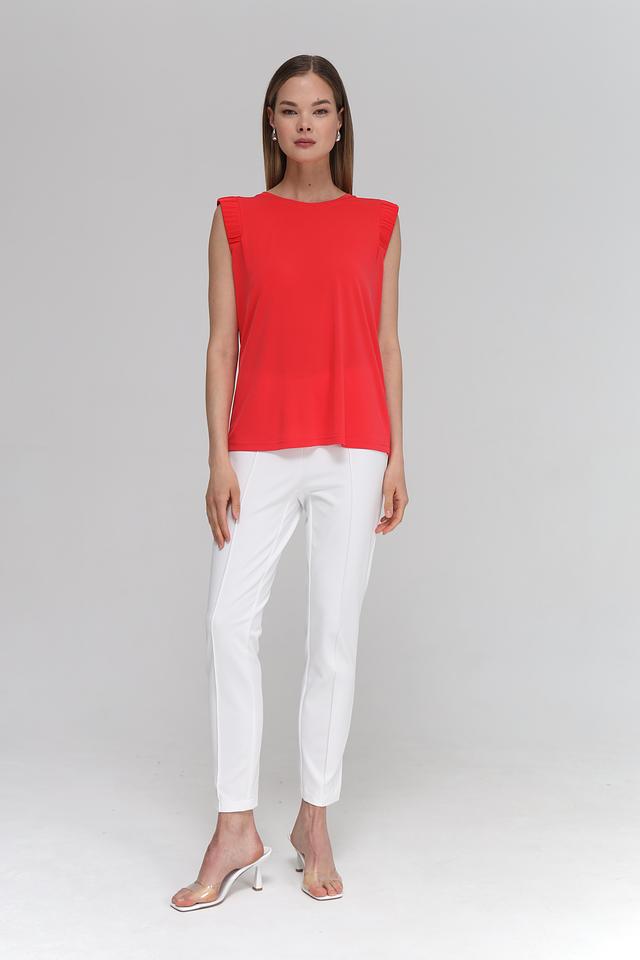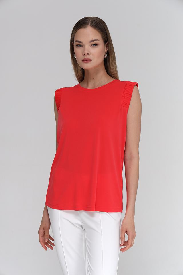 Топ имеет классический крой без рукавов и округлый вырез горловины. Особый акцент сделан на декоративные воланы на плечах, которые придают изделию женственность и оригинальность. Благодаря лаконичному дизайну, этот топ легко сочетается с различными предметами одежды – от джинсов и шорт до юбок и брюк.