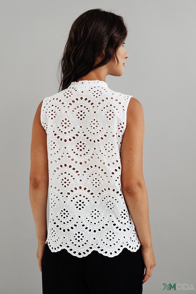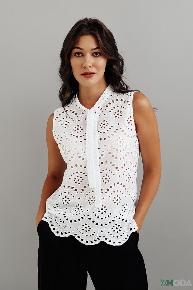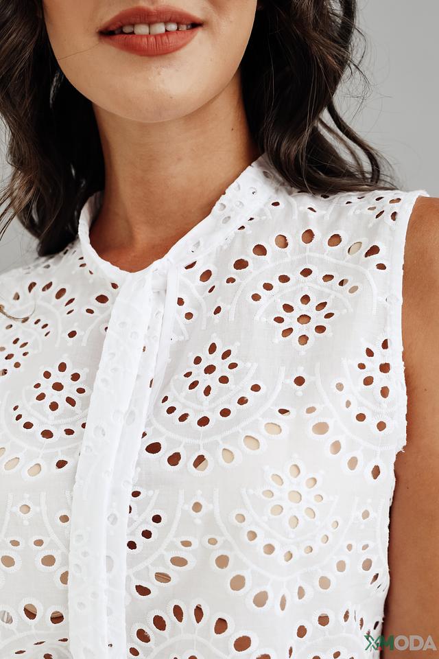 Особенностью данного топа является ажурная вышивка, покрывающая всю поверхность изделия. Декоративные элементы выполнены в виде мелких отверстий, создающих лёгкий и воздушный эффект. Воротник топа дополнен тонкими завязками, которые можно завязать бантиком или оставить свободно свисающими, создавая разные образы.