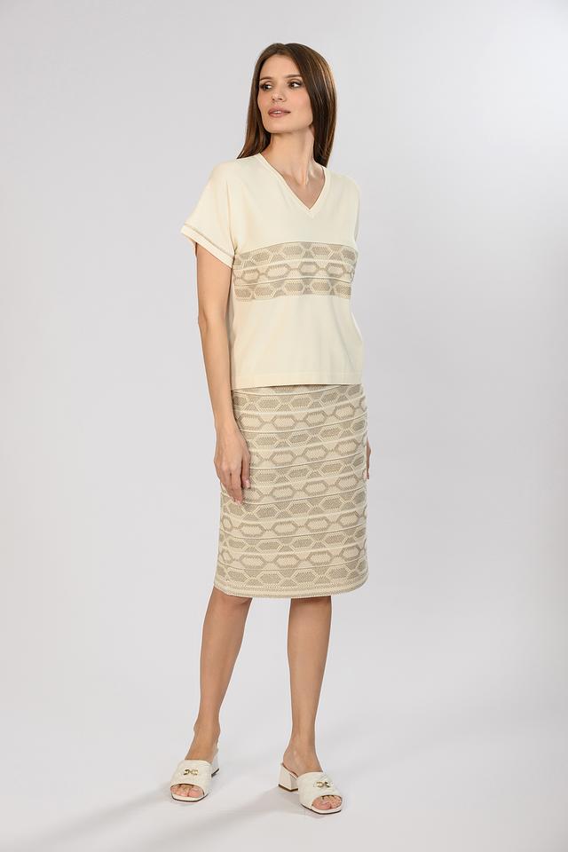 Эта юбка от бренда D. Exterior – отличный выбор для создания элегантного и современного образа. Изделие выполнено в бежевых тонах с выразительным геометрическим узором, который придает юбке особую изысканность.