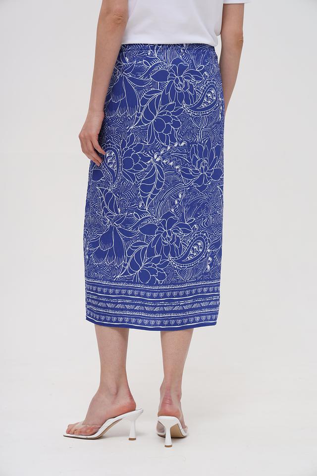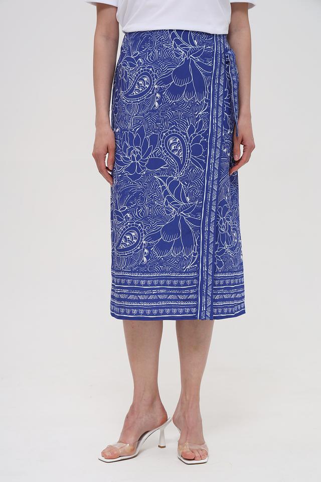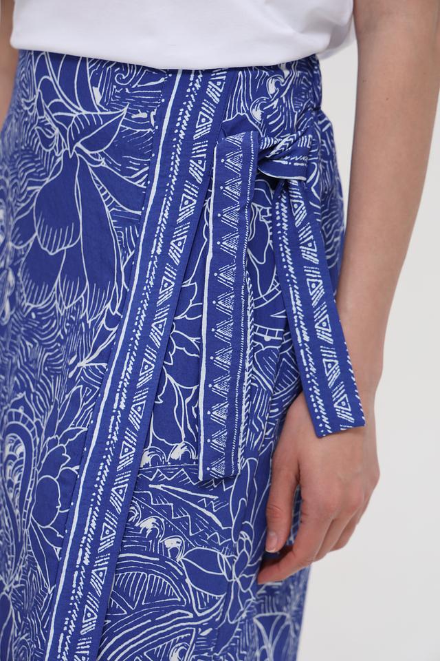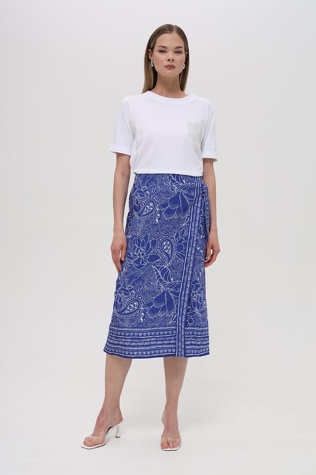 Юбка украшена оригинальным цветочным принтом в синих тонах, который придает ей неповторимый стиль. Завязывающийся пояс позволяет регулировать посадку по талии, обеспечивая комфорт и свободу движений. Эта юбка идеально подойдет для создания как повседневных, так и вечерних образов.