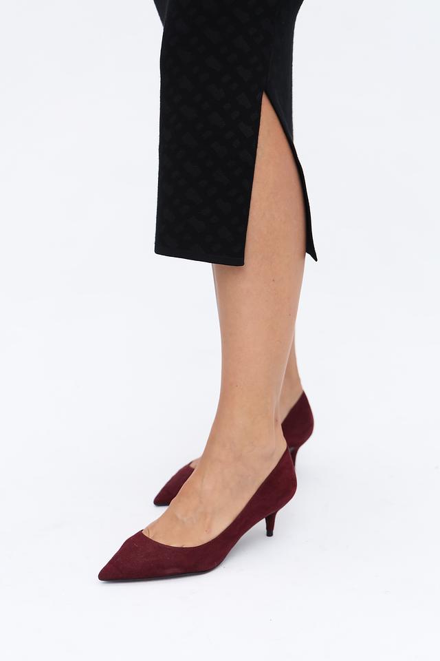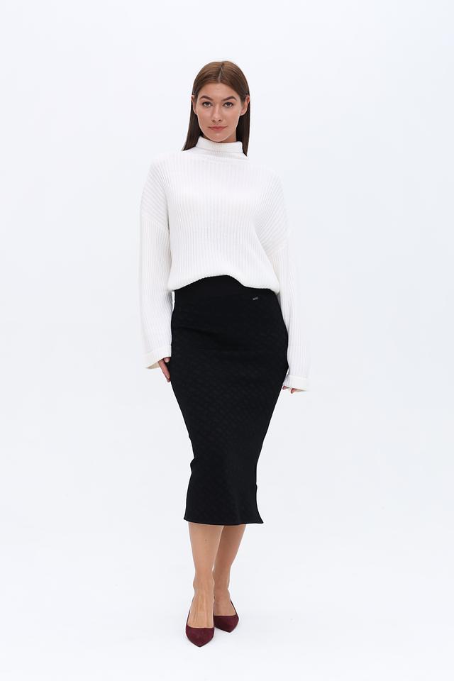 Юбка имеет приталенный силуэт и длину миди, что делает её подходящей для различных случаев – от деловых встреч до вечерних мероприятий. Текстурированная ткань с геометрическим узором придает модели особый шарм и визуальный интерес.
