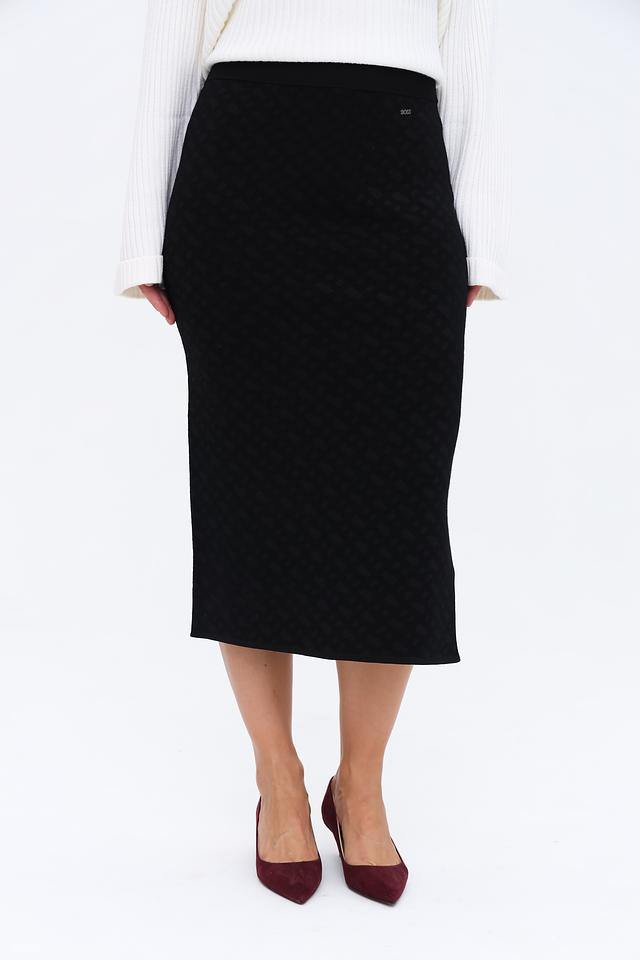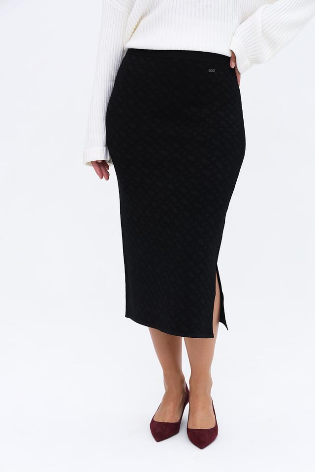 Чёрная юбка Boss Black из текстурированной ткани с геометрическим узором. Модель миди длины с разрезом сзади, идеально подходит для создания элегантного и стильного образа. Состав: вискоза 74%, полиамид 14%, полиэстер 10%, эластан 2%