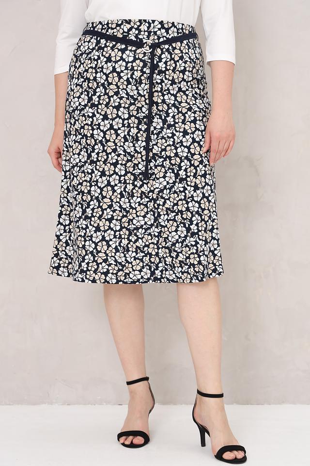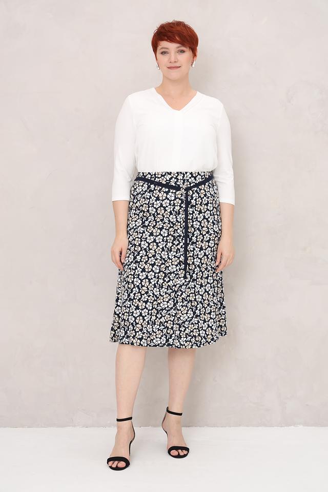 Юбка имеет классическую длину миди и прямой силуэт, который подходит для любой фигуры. Декорирована она мелким цветочным принтом на темно-синем фоне, что придает ей романтичное настроение. Застежка-пояс позволяет регулировать посадку по талии и подчеркивать достоинства силуэта.