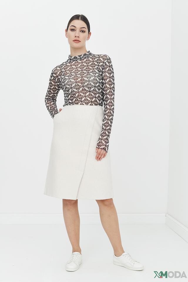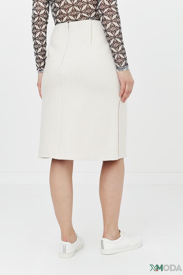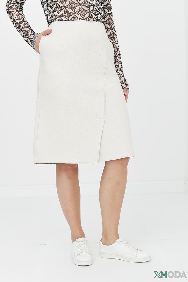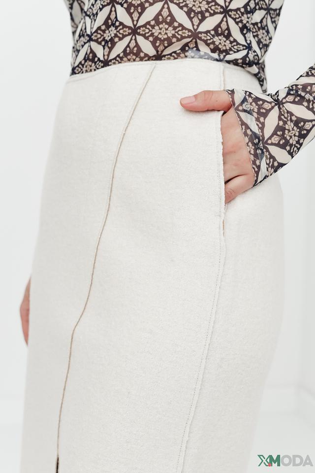 Юбка имеет классическую длину миди и асимметричный крой с запахом, который визуально стройнит фигуру и придает образу динамичность. Декоративная отделка в виде вертикальной вставки подчеркивает силуэт и добавляет юбке элегантности.