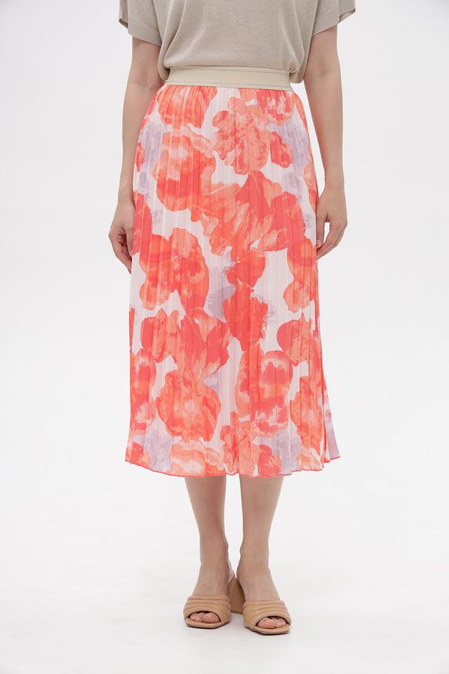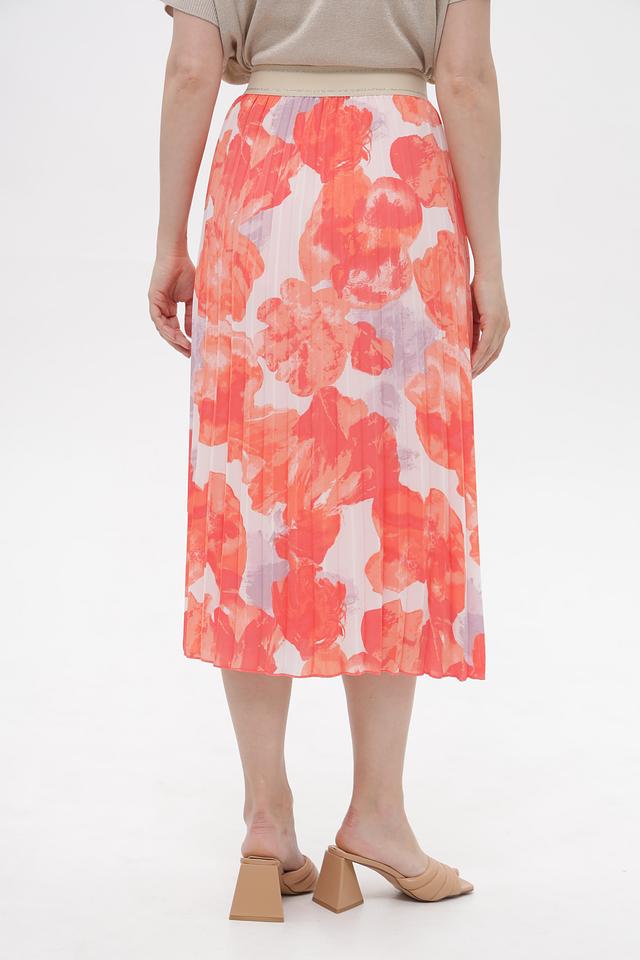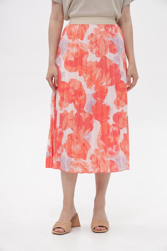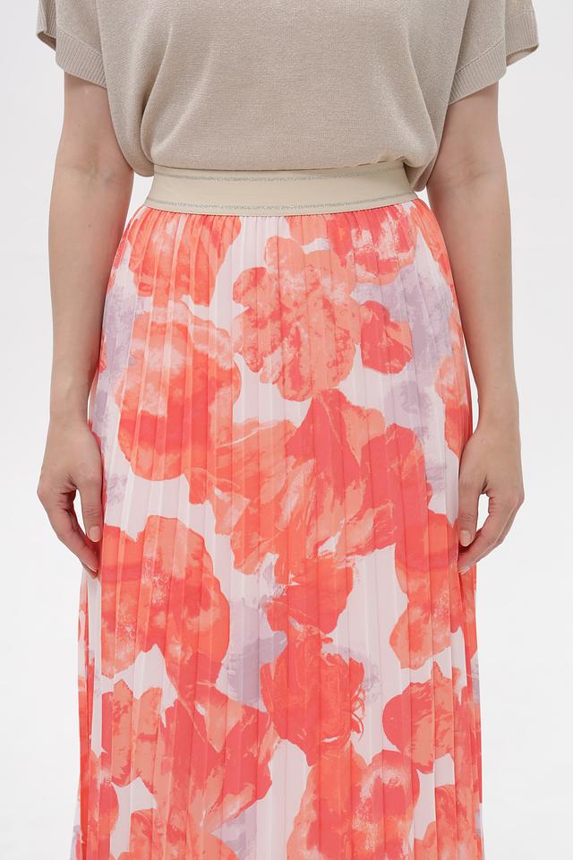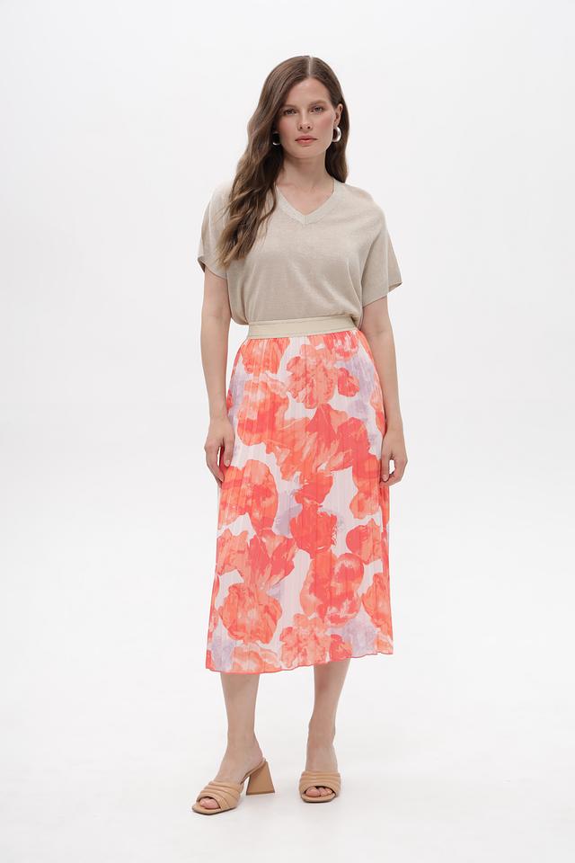 Модель украшена эффектным цветочным принтом в сочетании коричневого, оранжевого, розового и серого оттенков. Плиссированная текстура добавляет юбке воздушности и динамики.
