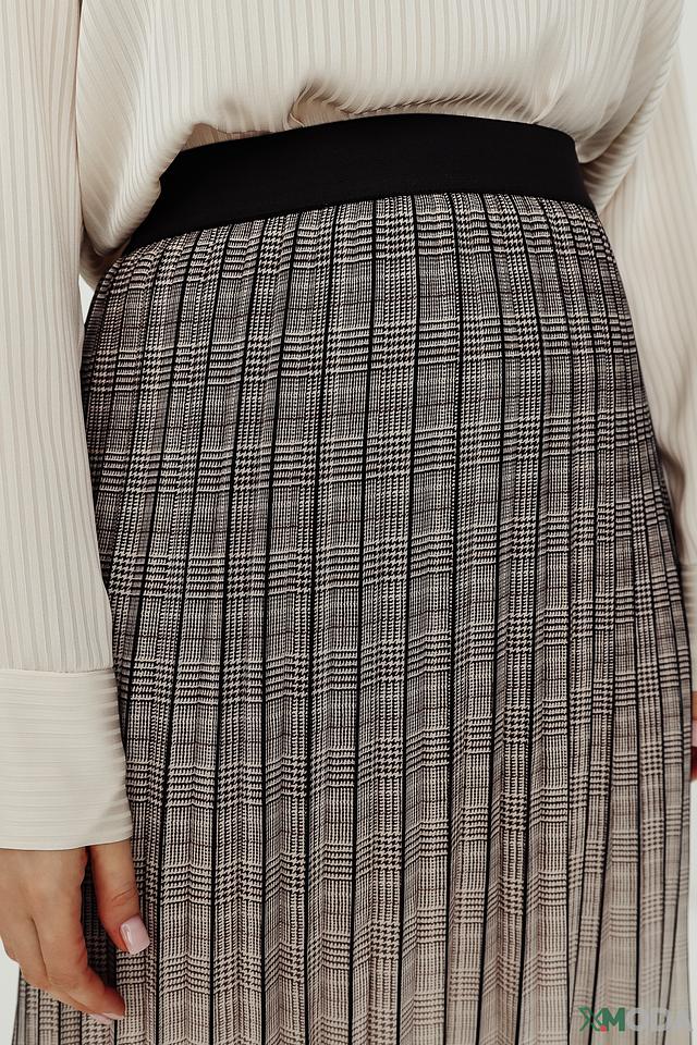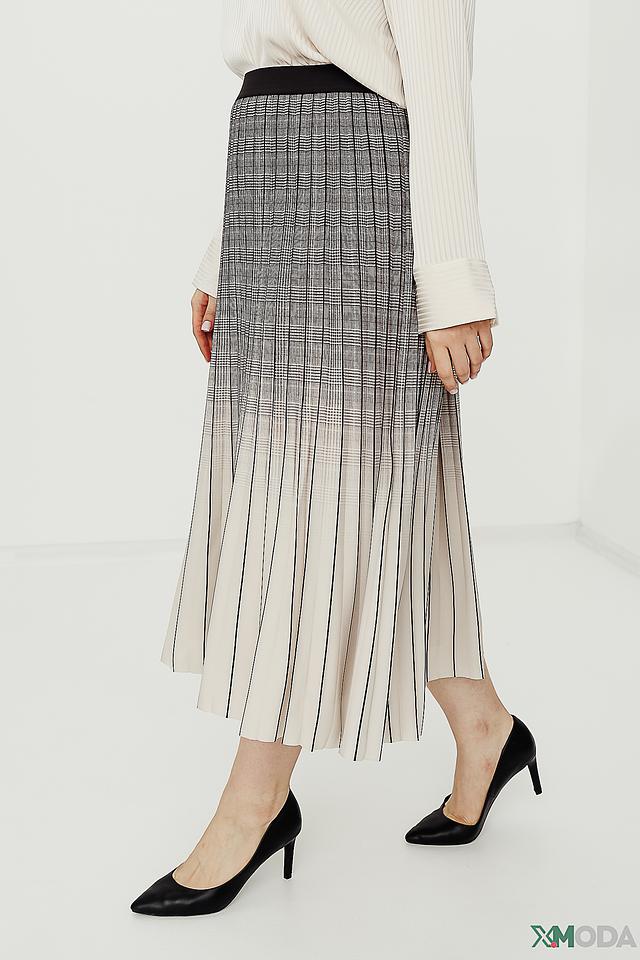 Юбка имеет плиссированную юбку, которая красиво драпируется и создает легкий, воздушный силуэт. Эластичный пояс обеспечивает комфортную посадку по фигуре.