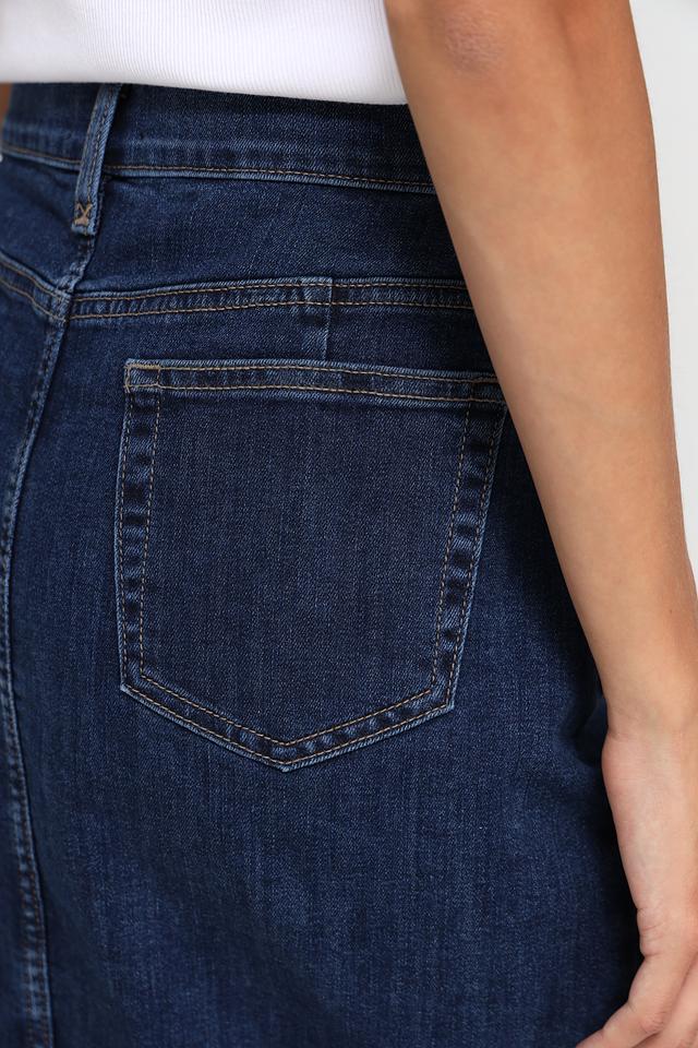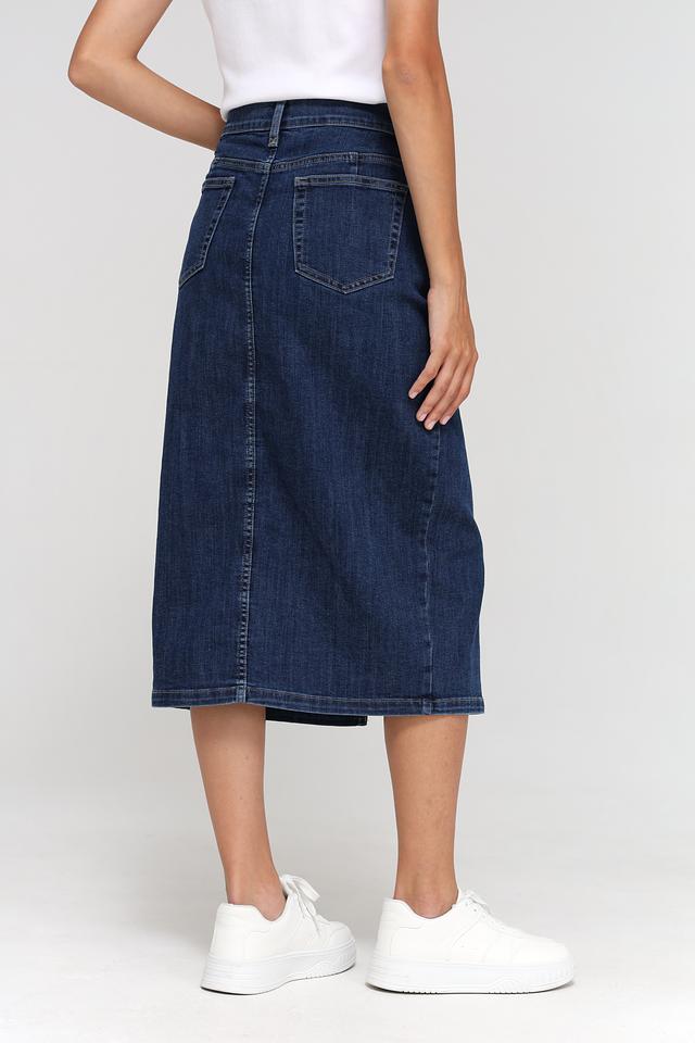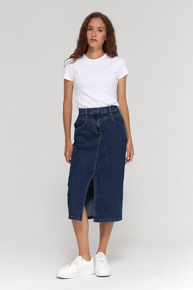 Юбка имеет классический синий цвет и прямую форму. Застежка на молнию и пуговицу. На передней части юбки расположены функциональные карманы. Сзади – накладной карман.
