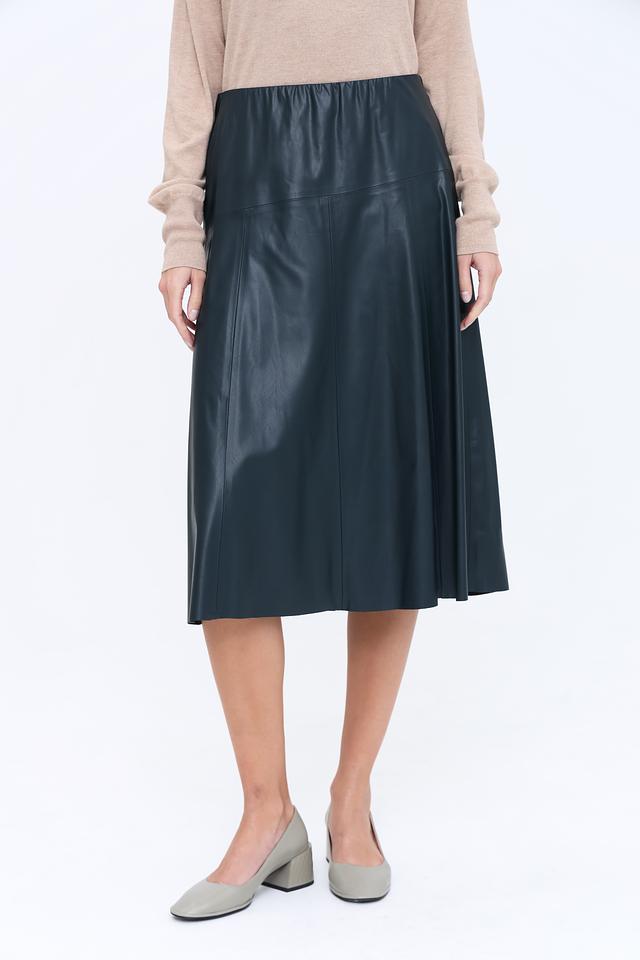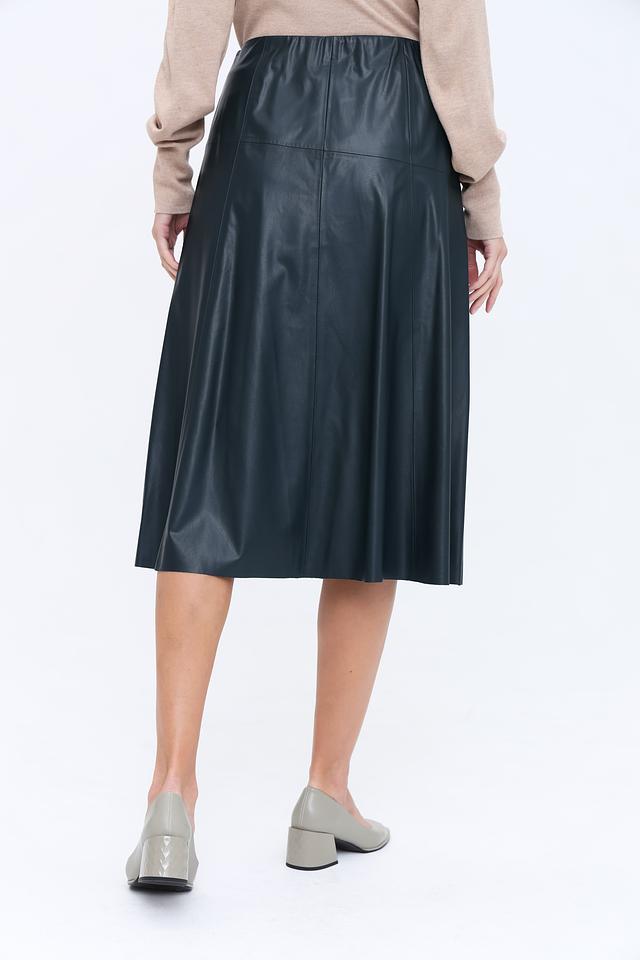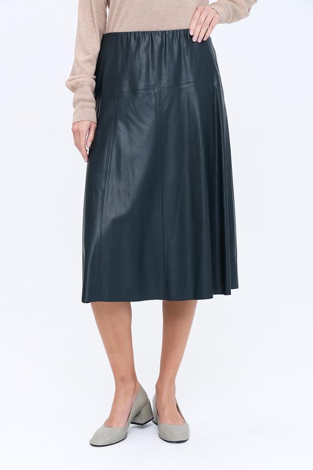 Юбка Gerry Weber тёмно-зелёного цвета выполнена из эко-кожи с эластичным поясом. Модель имеет А-силуэт и длину миди, что делает её универсальным элементом гардероба. Состав: вискоза 85%, полиэстер с полиуретан.покрытием 15%