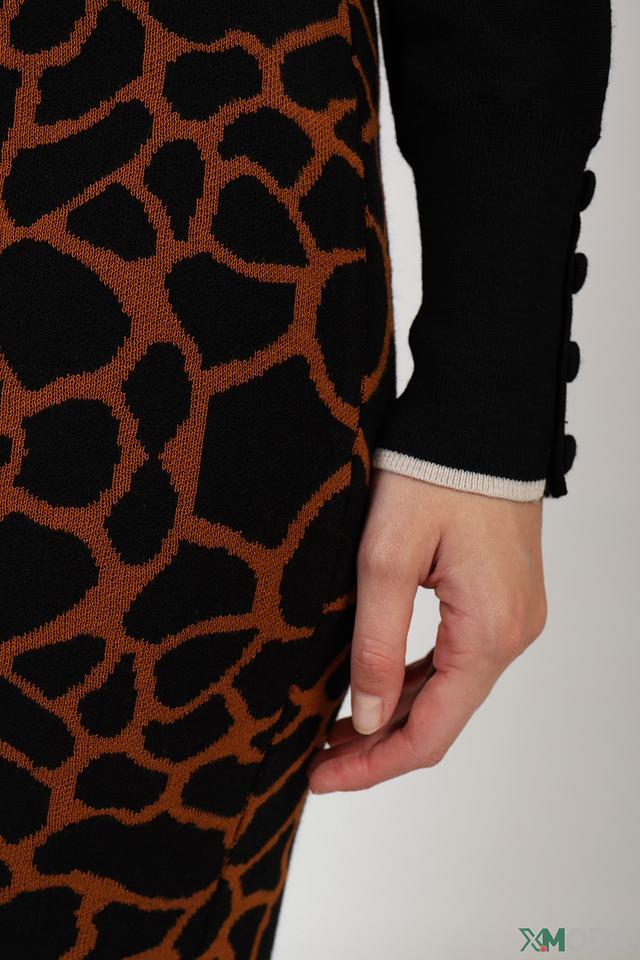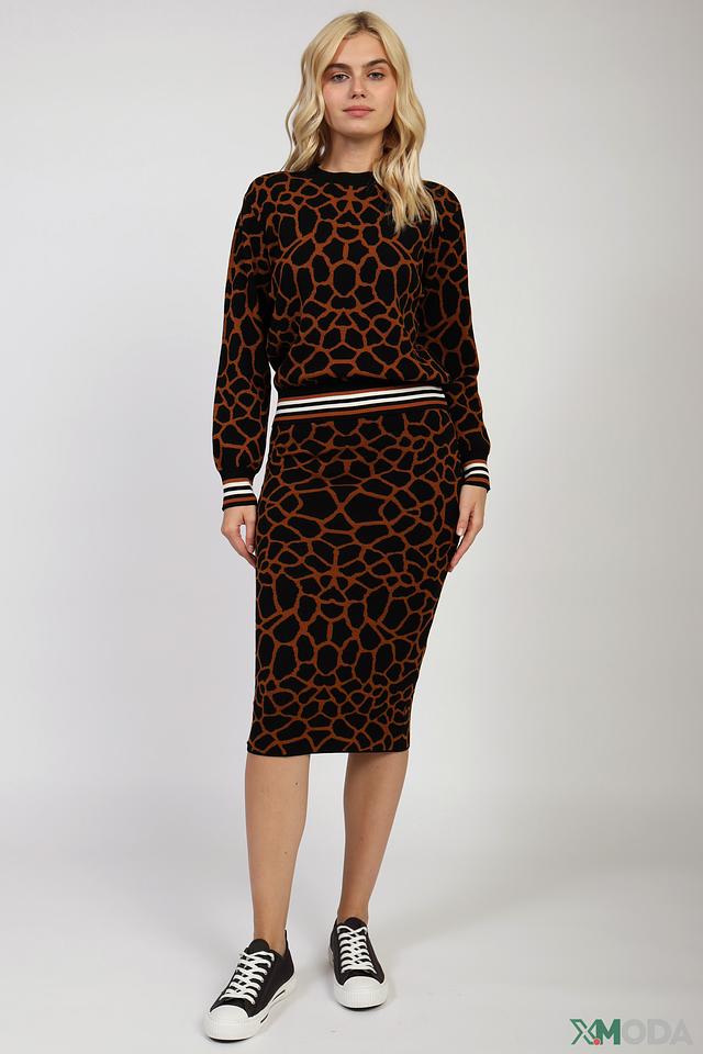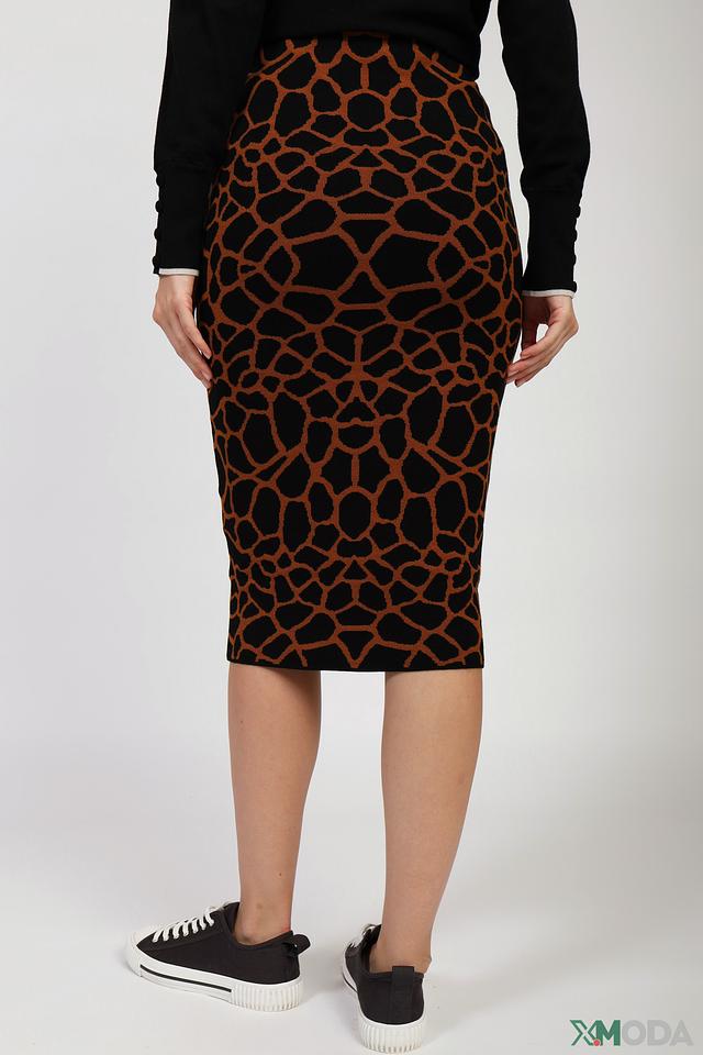 Основной цвет юбки – коричневый, но ее главная особенность – это уникальный принт, имитирующий текстуру кожи рептилии. Такой рисунок добавляет образу оригинальности и стиля.