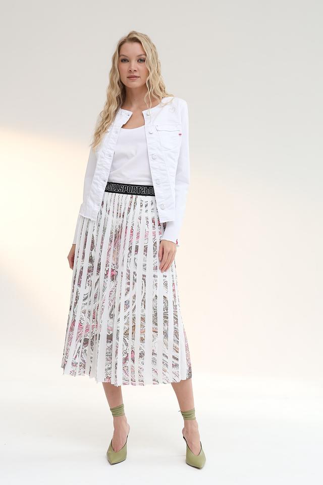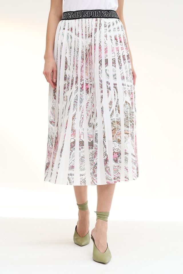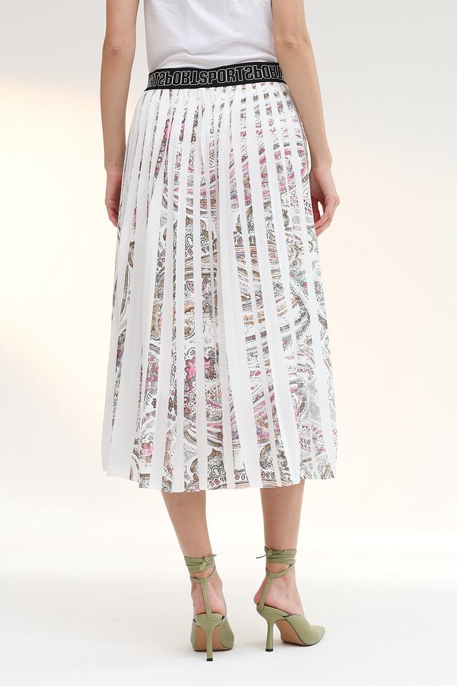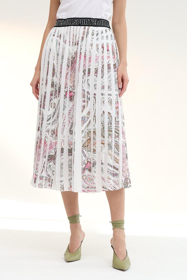 Юбка имеет плиссированный крой, который придает ей элегантность и динамичность. Особенностью модели является красочный цветочный принт, выполненный в нежных оттенках розового, красного и бежевого. Широкий эластичный пояс с логотипом бренда обеспечивает комфортную посадку по фигуре.