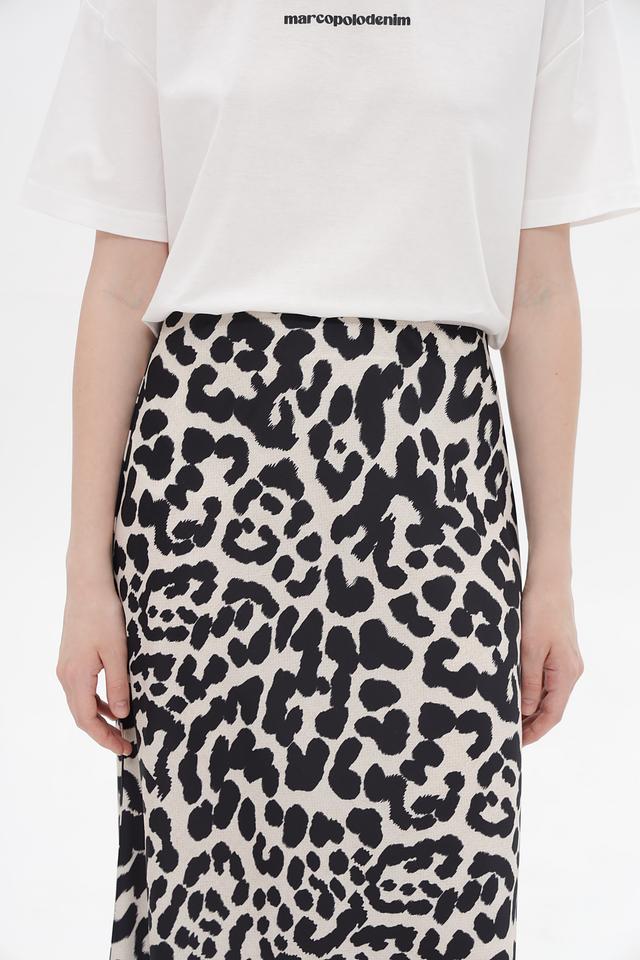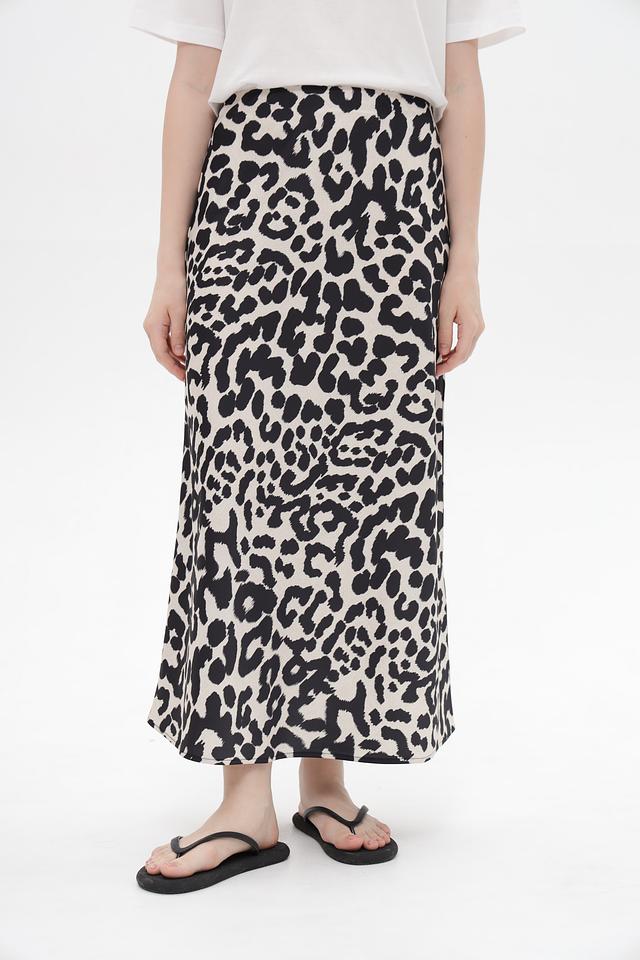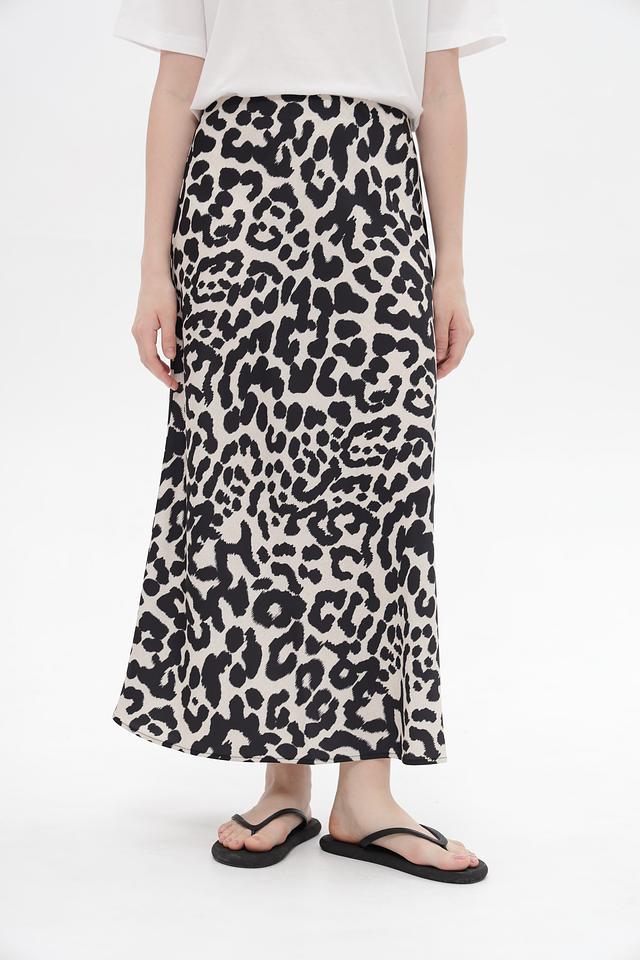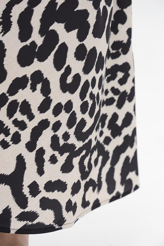 Юбка имеет длину миди и прямой крой. Её украшает эффектный леопардовый принт в бежевых и чёрных тонах, который придаёт ей динамичный и современный вид. Ткань юбки лёгкая и приятная на ощупь, что делает её идеальной для тёплой погоды.