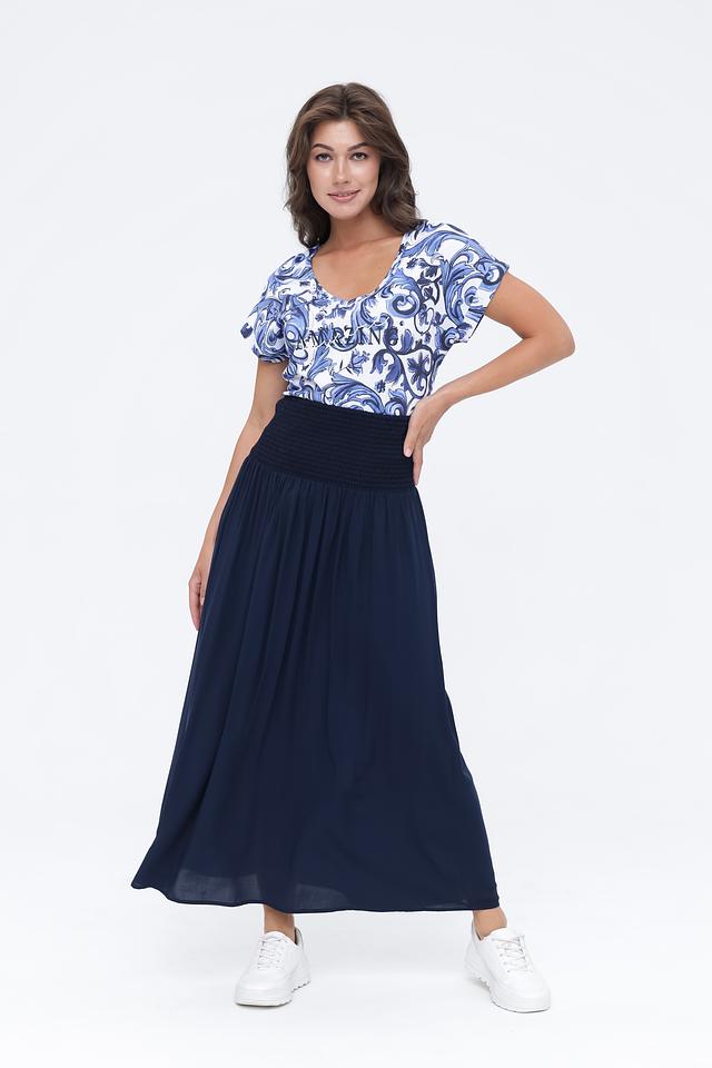 Модель отличается высокой посадкой и эластичным поясом, который обеспечивает надежную фиксацию и подчеркивает талию. Юбка имеет свободный крой, который не сковывает движений и позволяет создать легкий и непринужденный образ. Длина юбки – макси, что делает ее подходящей для различных случаев.