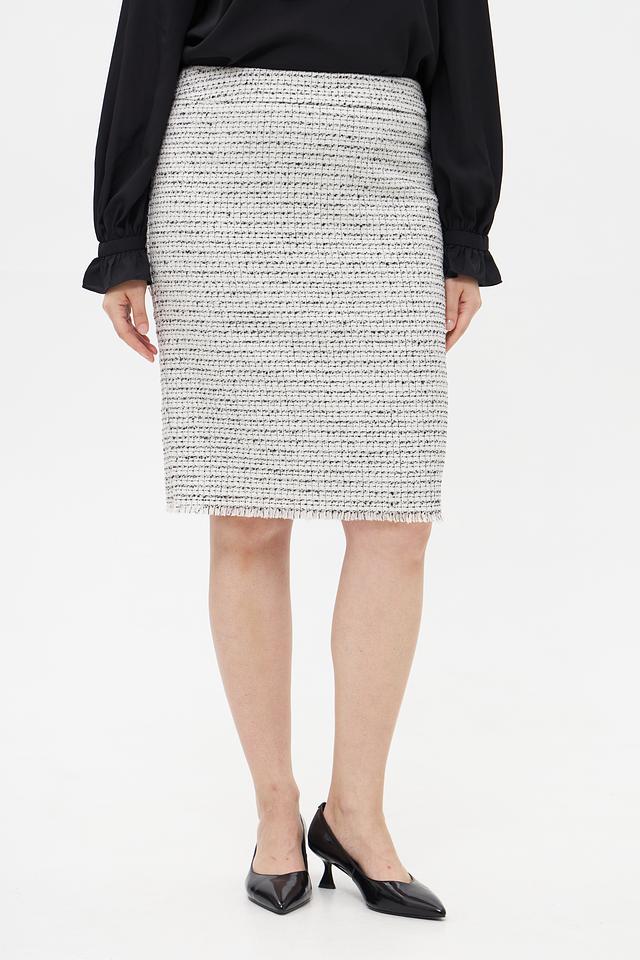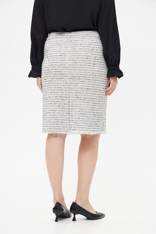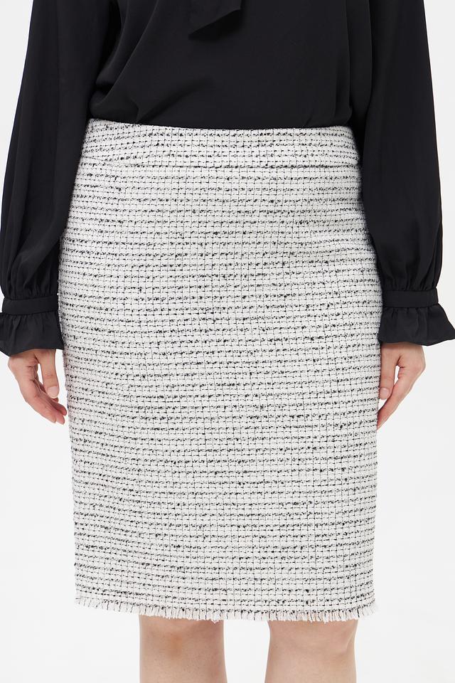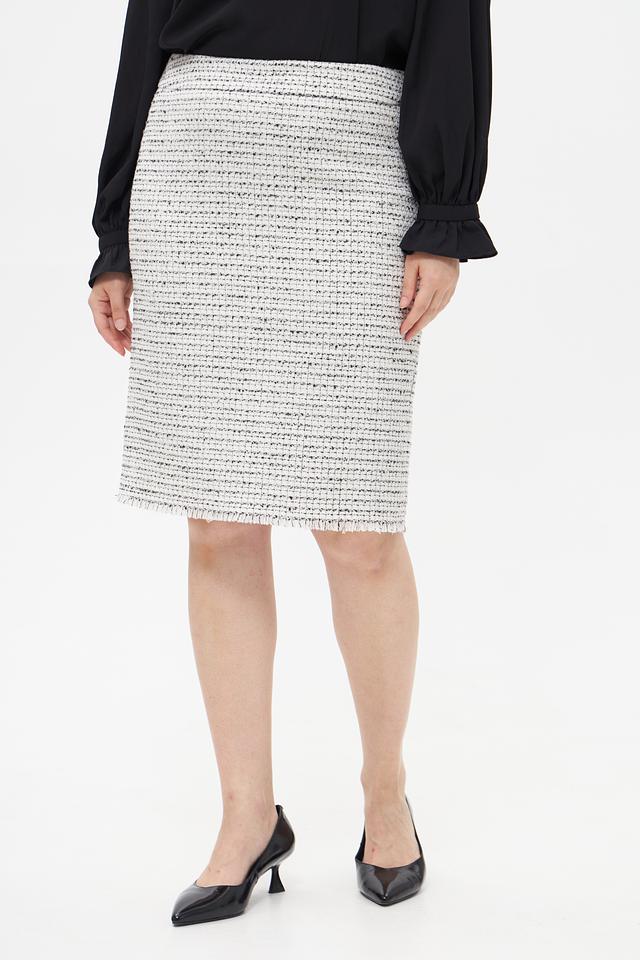 Юбка-карандаш от бренда Olsen выполнена из фактурной ткани в классическую клетку белого, серого и черного цветов. Модель имеет прямую посадку по фигуре и длину до колена.