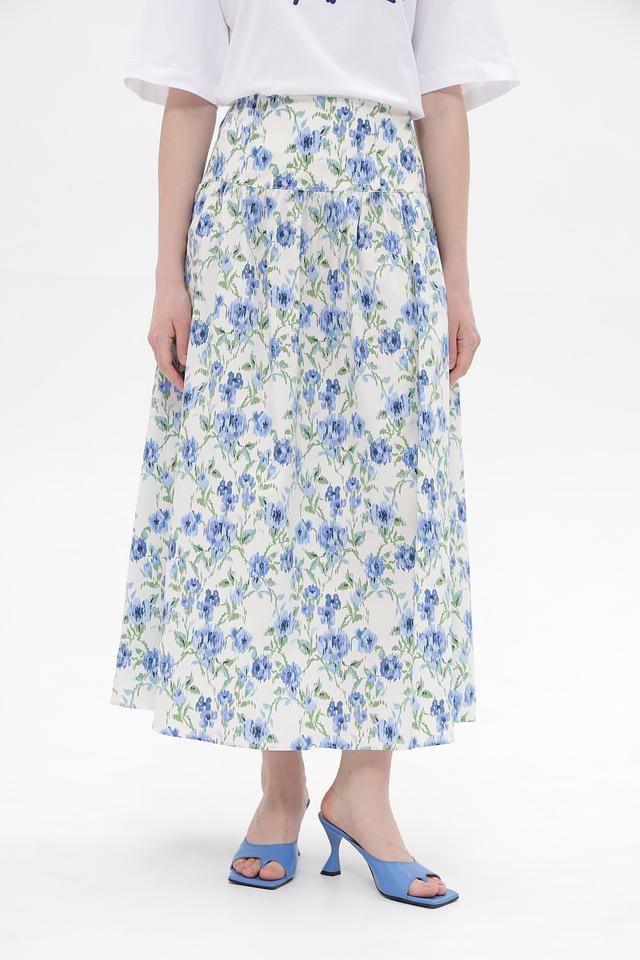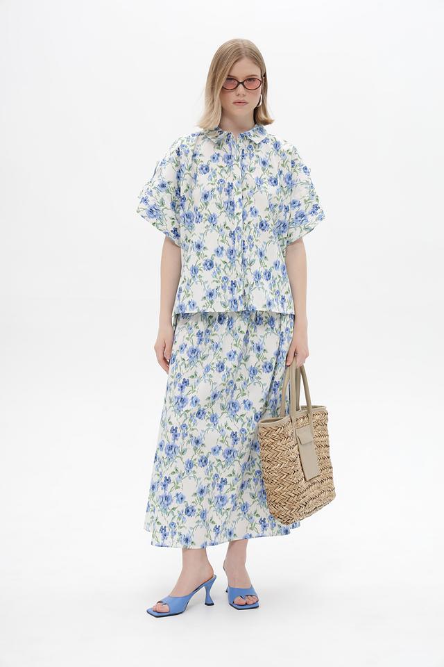 Юбка имеет длину миди и свободный крой, который не сковывает движений. Основной цвет – белый, украшенный мелким цветочным принтом в голубых тонах. Эластичный пояс обеспечивает удобную посадку по фигуре.