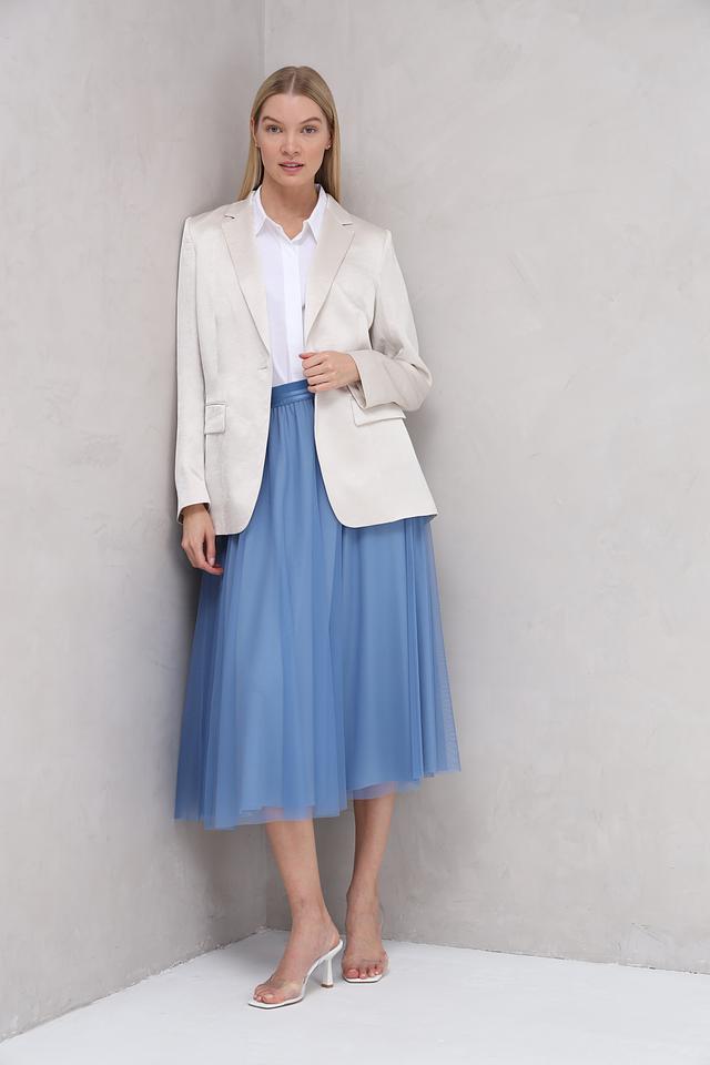 Юбка имеет длину миди и классический крой, который подходит для большинства типов фигур. Голубой цвет юбки делает её универсальным элементом гардероба, который легко сочетается с различными топами и обувью.