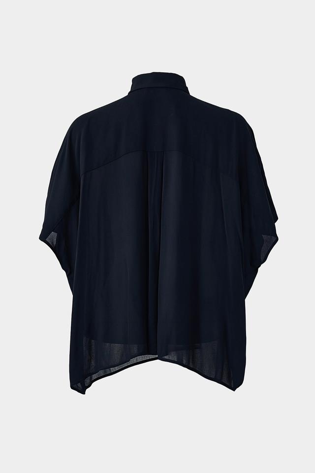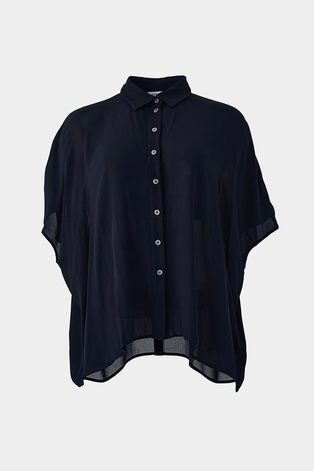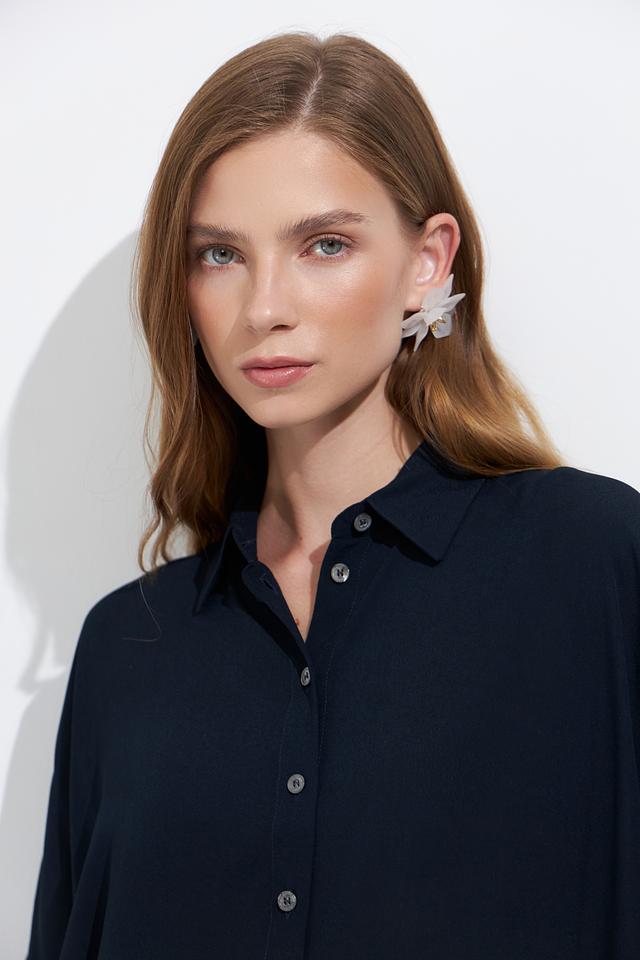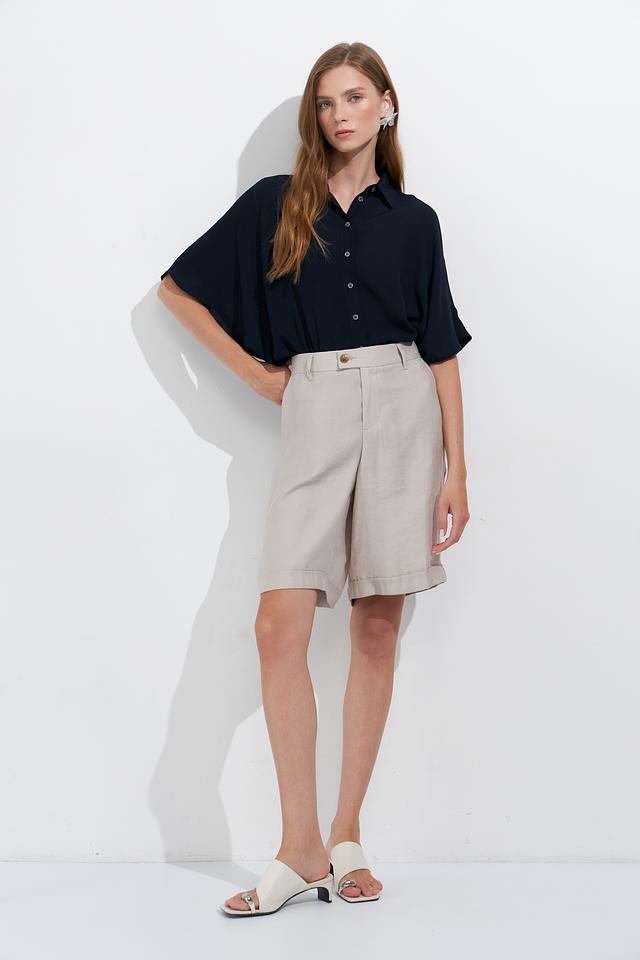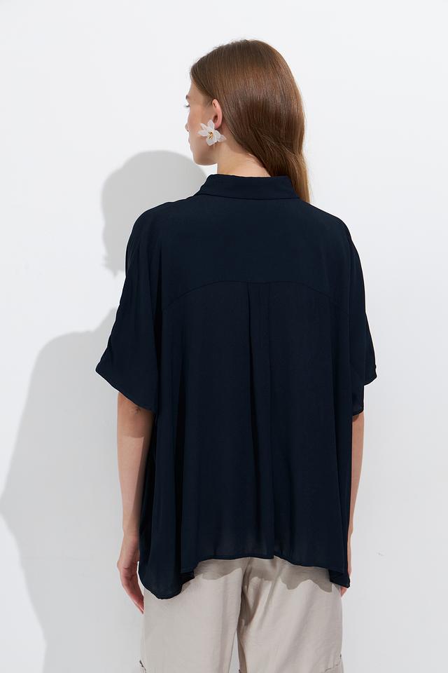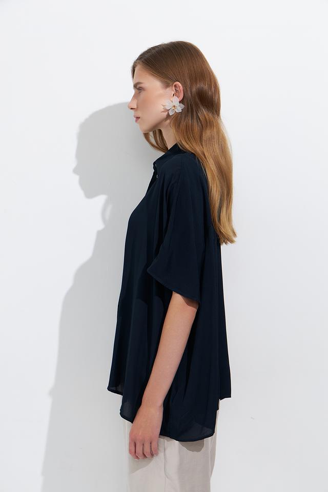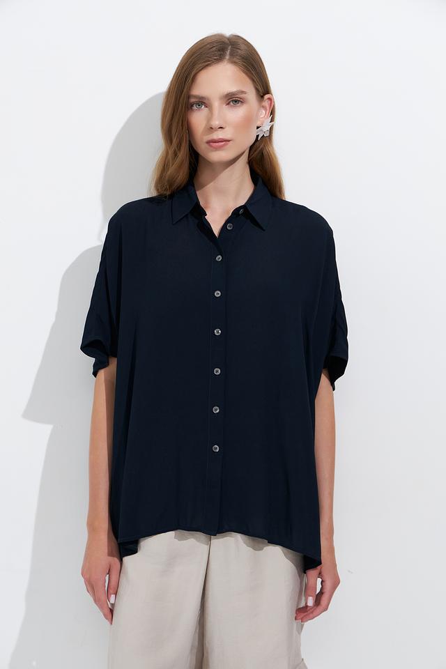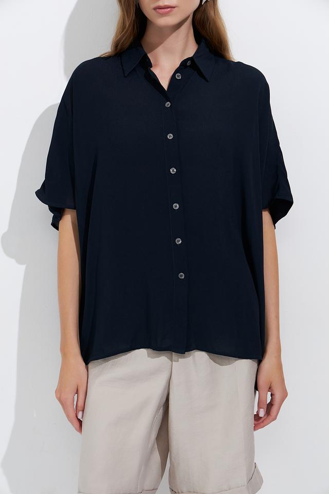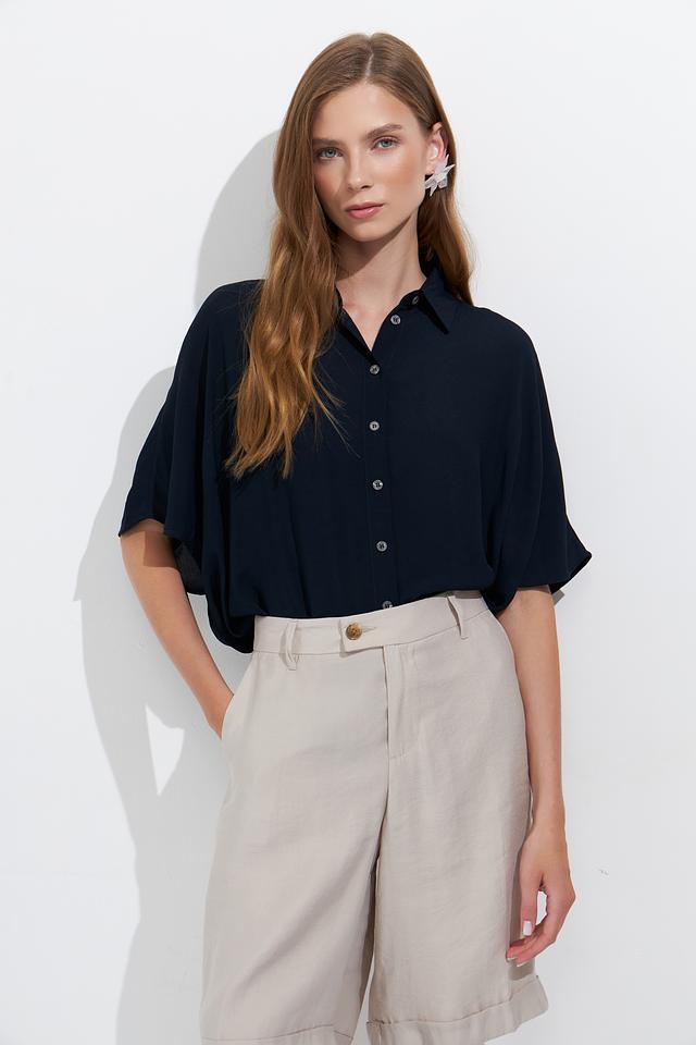 Блуза имеет свободный крой, который обеспечивает свободу движений и комфорт в носке. Короткие рукава делают ее подходящей для теплой погоды. Застежка на пуговицы позволяет регулировать степень открытости и создавать различные силуэты.